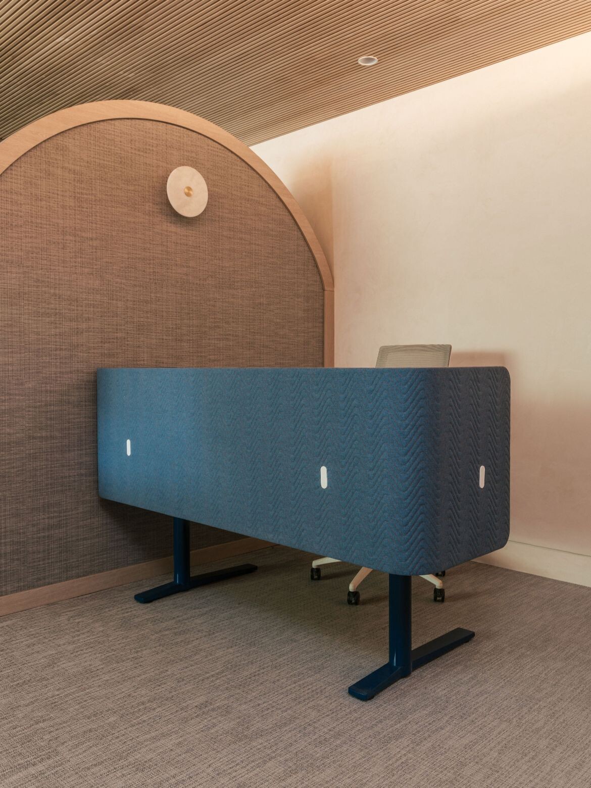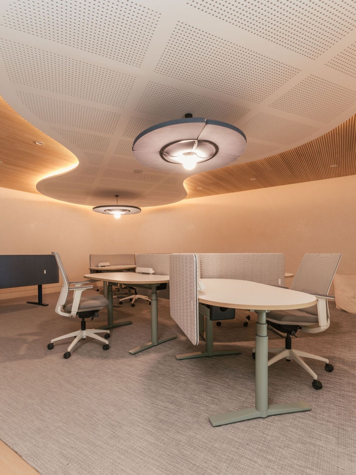 Acoustics bring a functional element and create a design opportunity. Acoustic materials are integrated seamlessly, from workstation screens to sculptural lighting elements, adding a gentle hush throughout the office. This acoustic layering contributes to a sense of calm and focus, elevating the everyday experience of the workplace. Rather than being hidden, these pieces are celebrated as part of the material story.