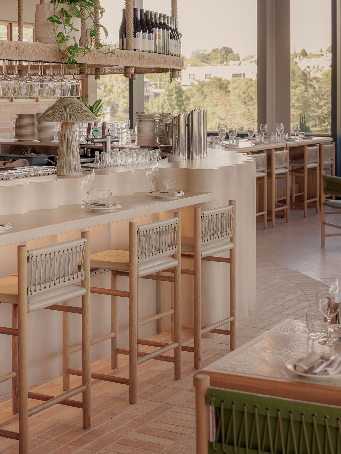 Conceived as an immersive social space, the interiors combine casual and chic with wooden tables, fully upholstered banquette seating and a palette that leans into greens and yellows, which is a deliberate break from the more predictable terracotta tones often associated with Mediterranean dining rooms. Texture and colour do the heavy lifting, supported by music, movement and the constant presence of water views, just beyond.