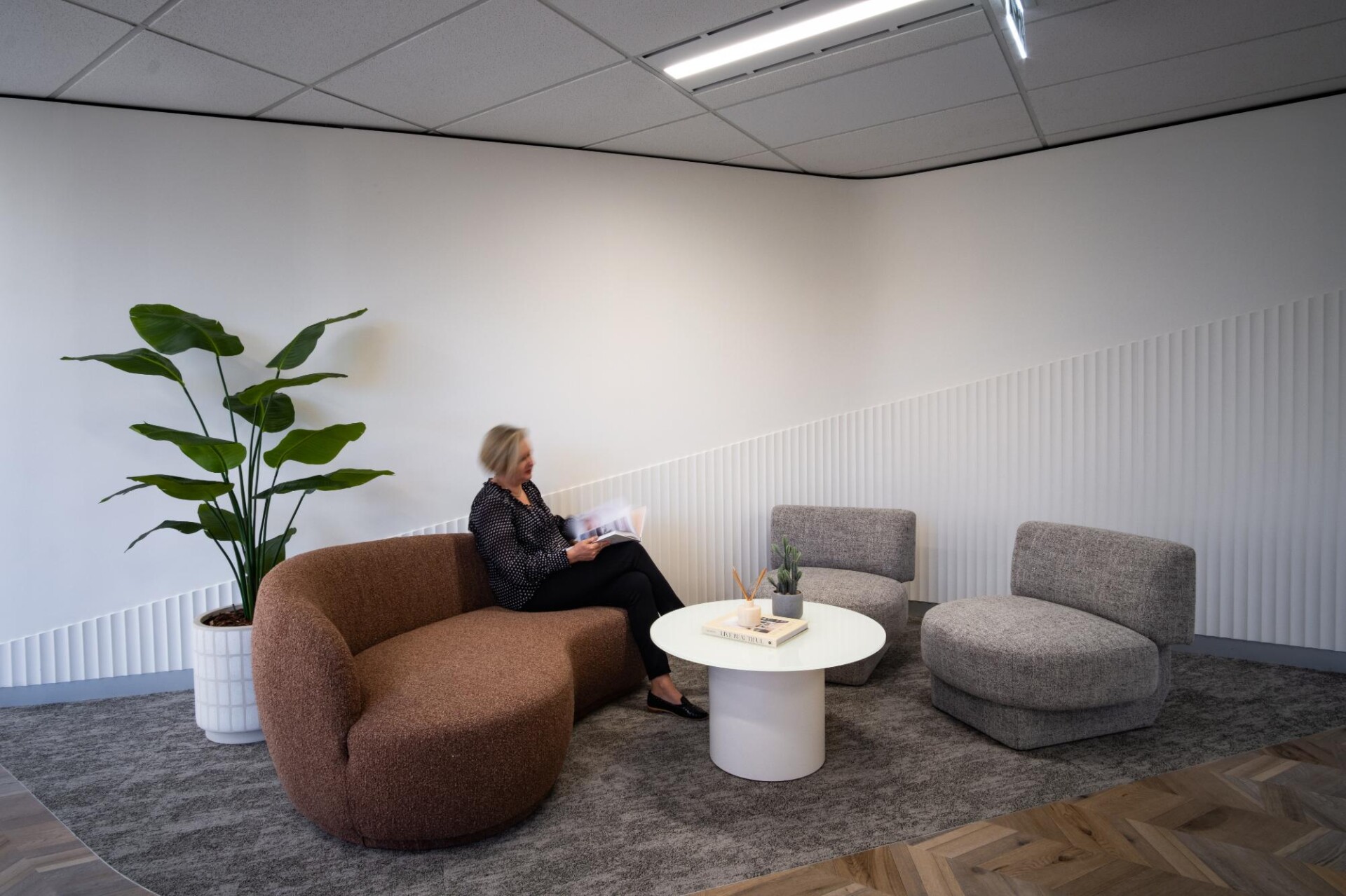 Material choices also play a powerful role in the transformation. Milliken flooring establishes the foundation of the scheme, with Mixed Formations, Made of Wood Luxury Vinyl Tiles (LVT) in Gunnison Tan introducing a tactile, timber-like warmth to the circulation and break-out areas, while Milliken carpet tiles from the Poise and Distinct Forms collections add a subtle depth to the meeting room and waiting areas.