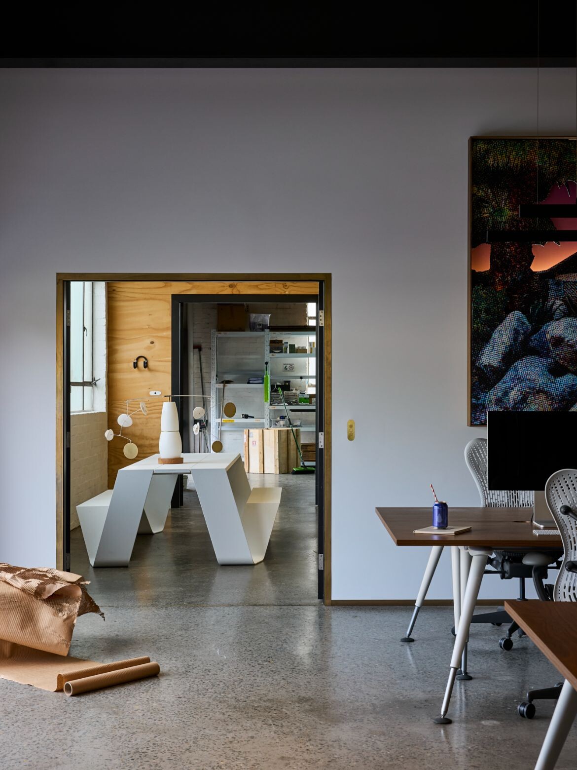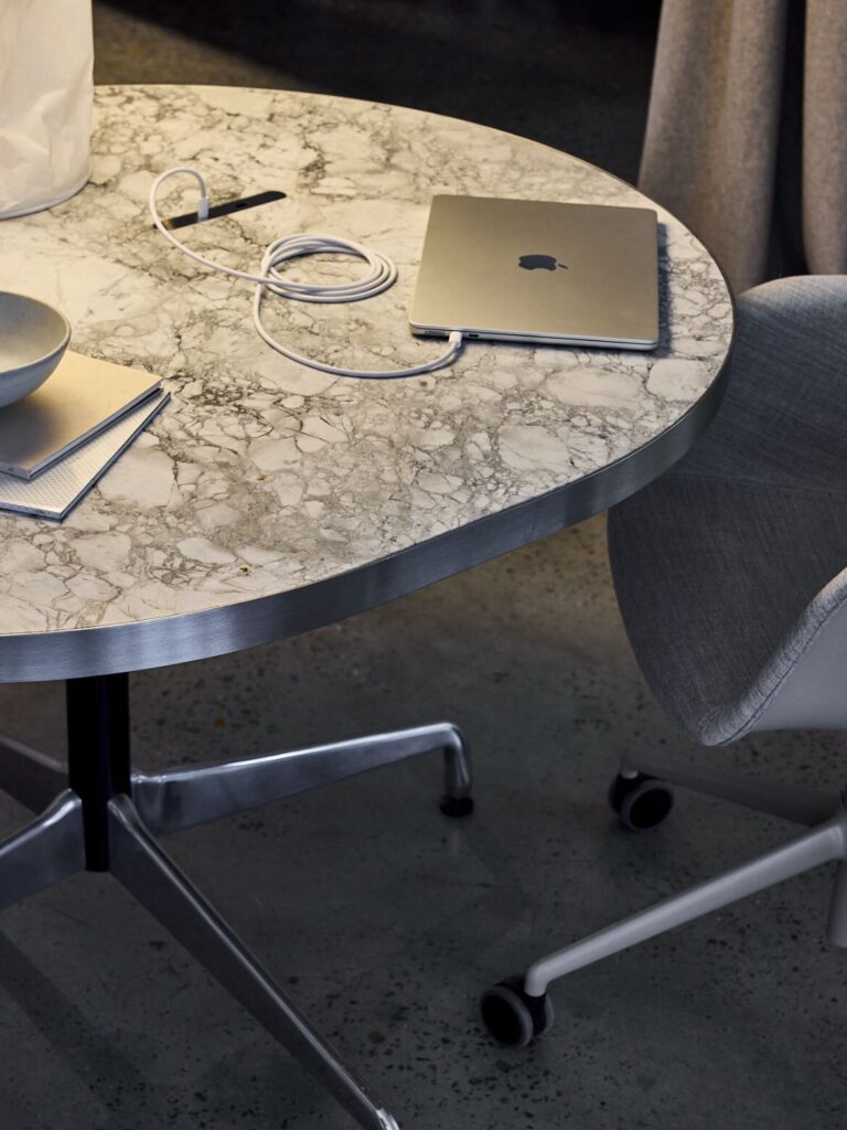 In the social area, the team can gather around an Extremis Hopper Picnic Tablein white, while client consultations and meetings utilise a Herman Miller Eames Segmented table. This table was fully constructed from leftover components and features a custom tabletop that incorporates ZETR’s 25 CONNECT power and data system designed for seamless technology integration. Ex-display Muuto Fibre armchairs complete the functional and fabulous setting.