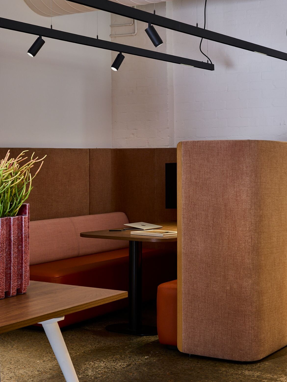 For private discussions, a refurbished Caon Bloc+ Meeting Booth provides a power-enabled modular seating zone that is cocooned from the energy and soundscape of the broader workplace. Also equipped with ZETR flush power, this David Caon-designed premium fitout element was retrieved by Relive by Living Edge from a corporate client.