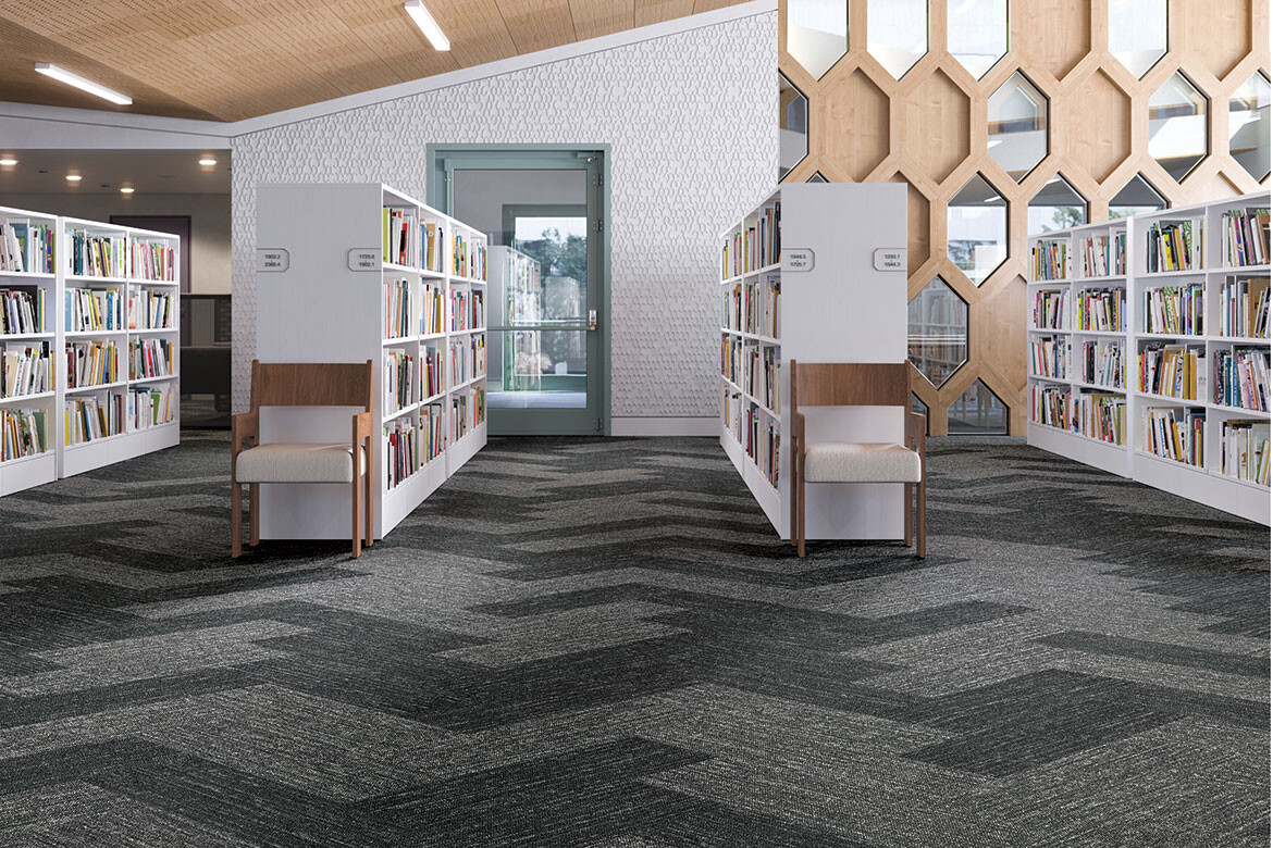 The variations echo natural textures of the landscape and its varied terrain, ornamented by purposeful, subtle trains of daily movement. The wide range of colours and the complementary pattern geometry of either Buzzing Trails or Gentle Ground in the carpet plank form enables designers to create zones and deliver a seamless visual continuity on the ground plane.