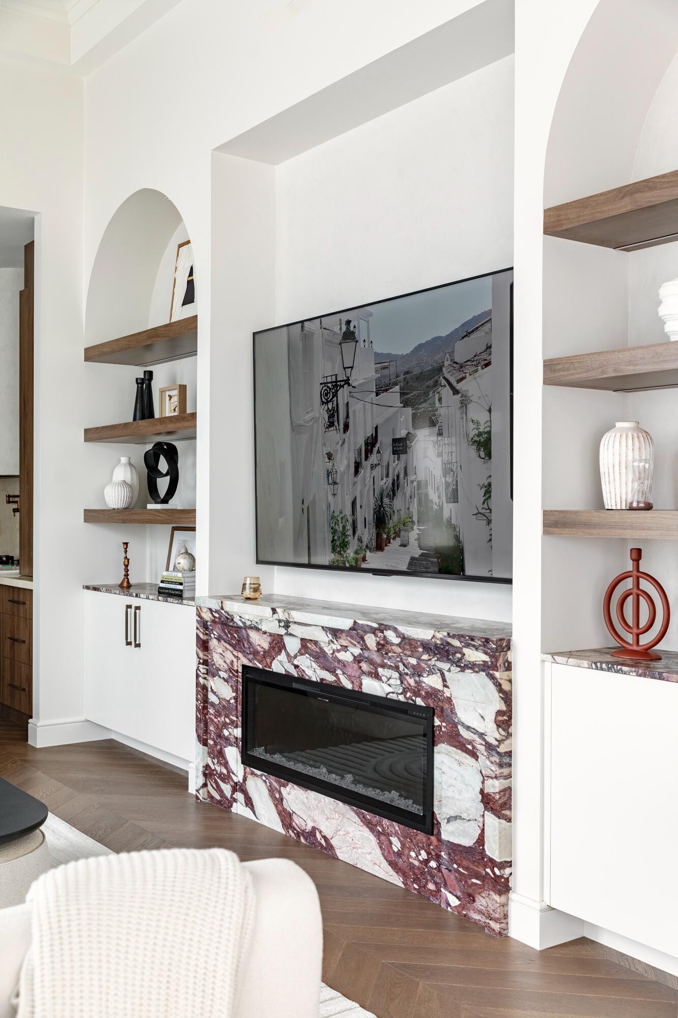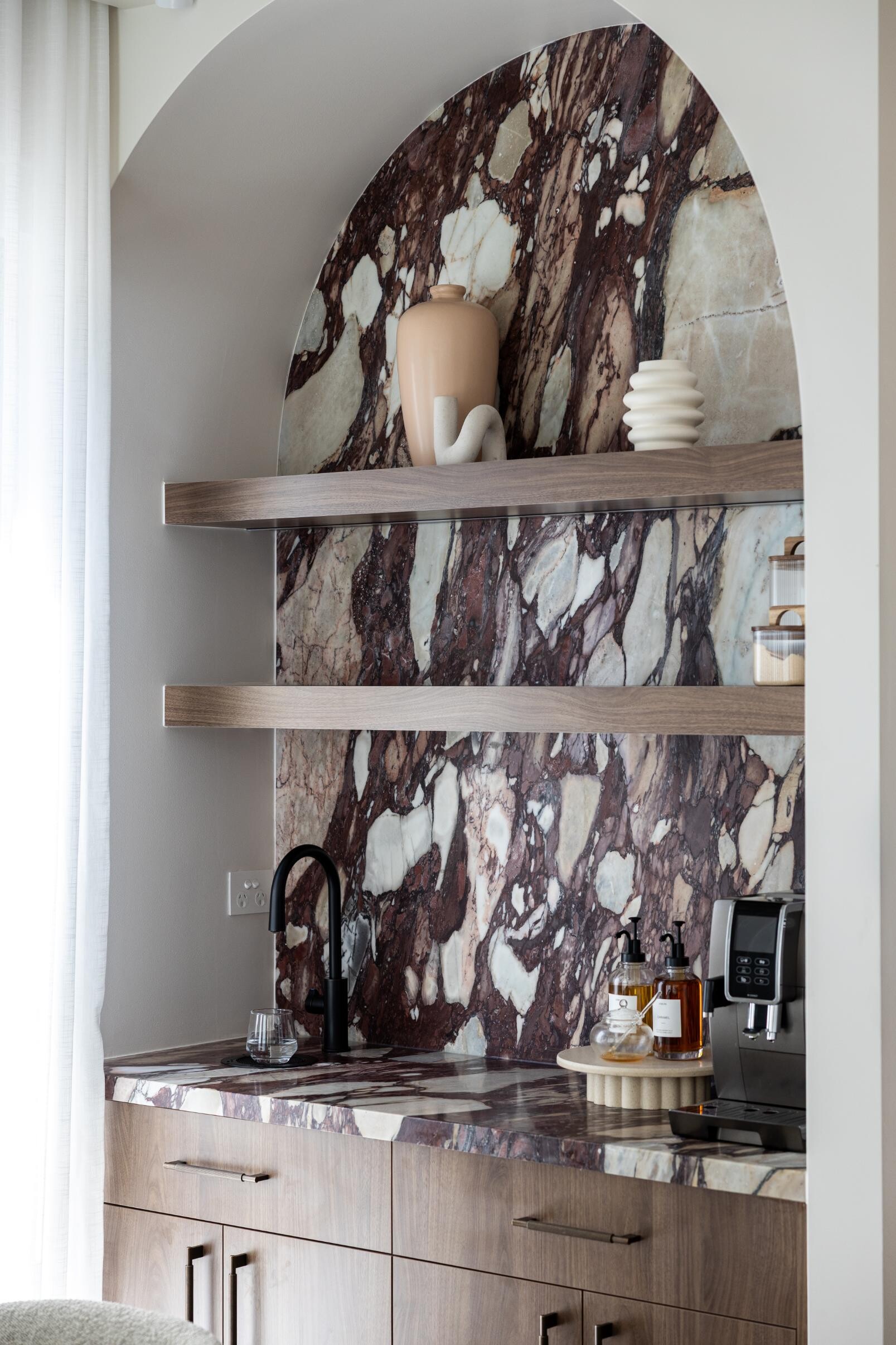 Comprising four bedrooms, three bathrooms, generous open-plan living area and entertainer’s kitchen with connected Butler’s pantry, primary palettes of timber, bronze and stone weave a coherent narrative of impeccable style. Shapes including arched portals and shelving and seamlessly configured cabinetry invite the eye to linger, flourishes and textures bring delight.