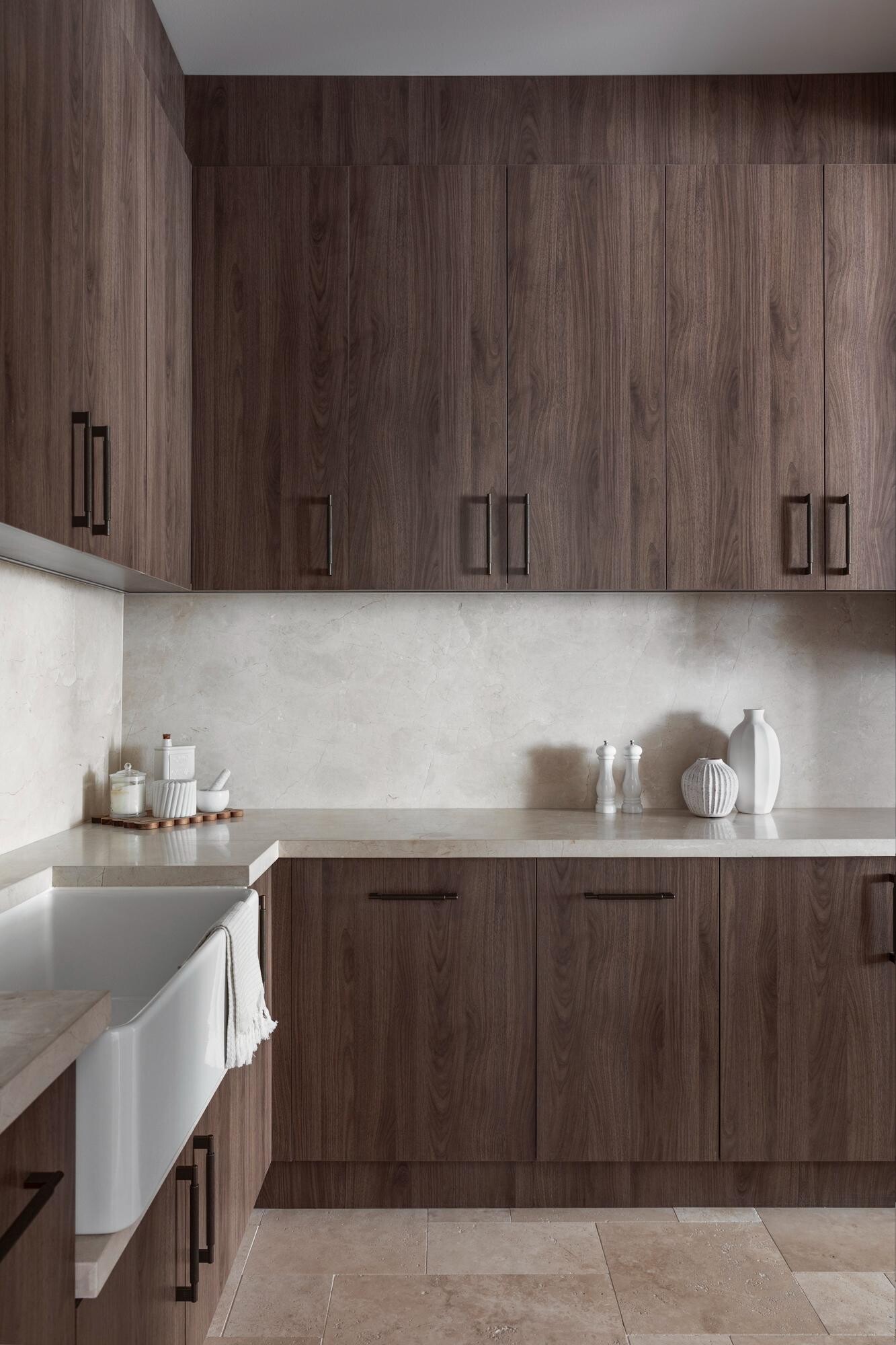 The air of glamour is subtle and expressed in the detailing, including a fine rounded bevel edge on the side of the island bench, and exquisite book matching across the marble of the splashback. The marble’s natural hues of cream, white and subtle misty grey have an organic flowing patterning that is reminiscent of water rippling over sand.
