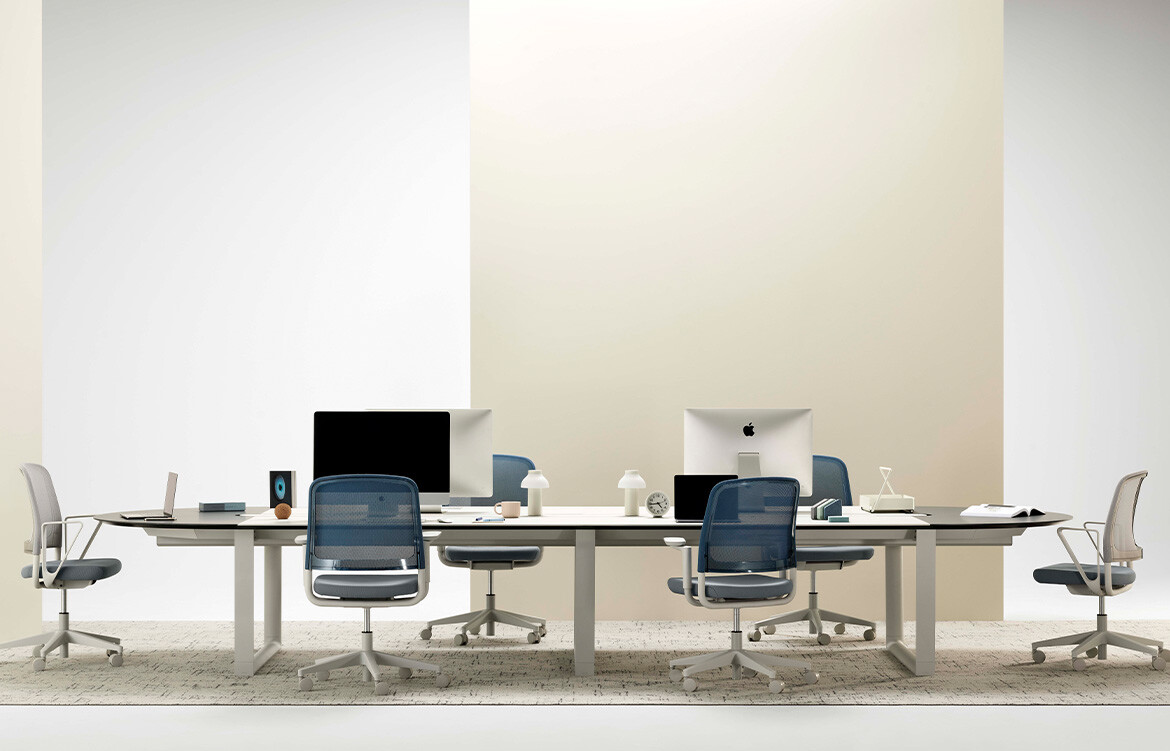 Toying with tension, the distinguishing feature of the Mekos table is the hoop leg form. The curved inner leg and soft lines more reminiscent of residential design, are contrasted with sharp, crisp lines expressed on the outside of the leg. Mekos tables function as either a collaboration table or dedicated workstation setting, providing a solution for focus or idea exchange, in both formal and informal spaces.