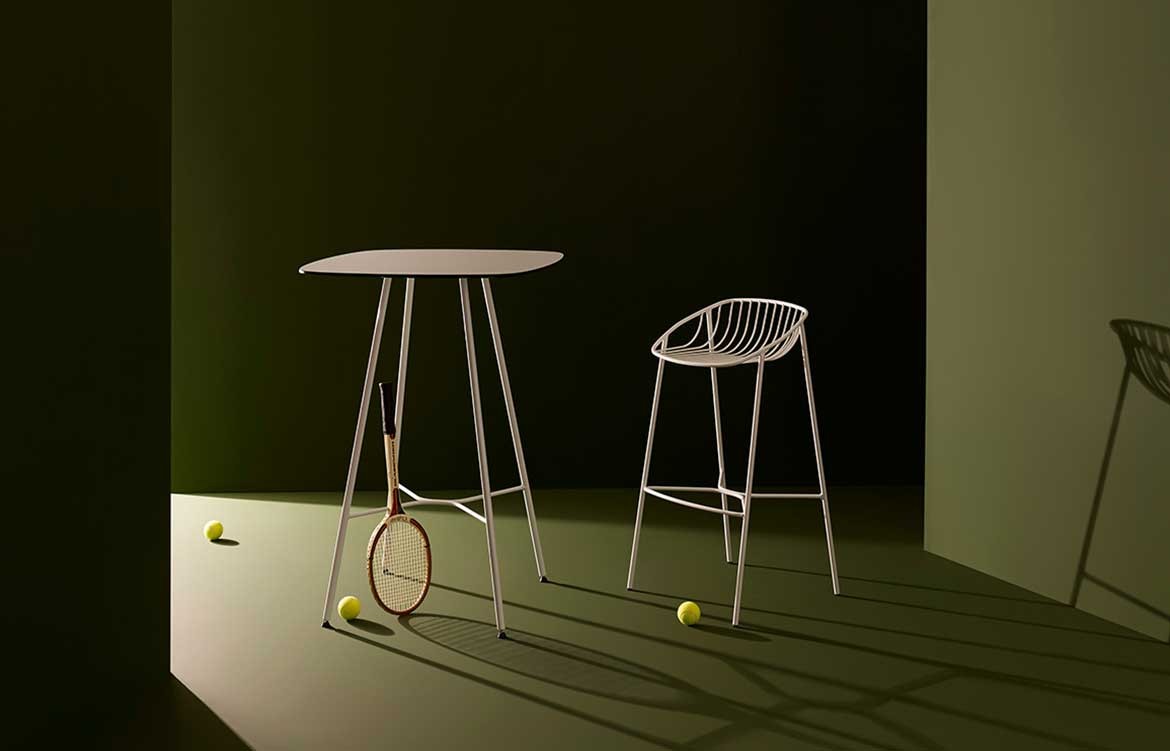 Pino is a contemporary and distinct collection of outdoor chairs and tables with a characteristic form. The hexagonal hoop supporting the seating wires gradually fan out and is uniquely supported by legs that extend up to the top of the chair.