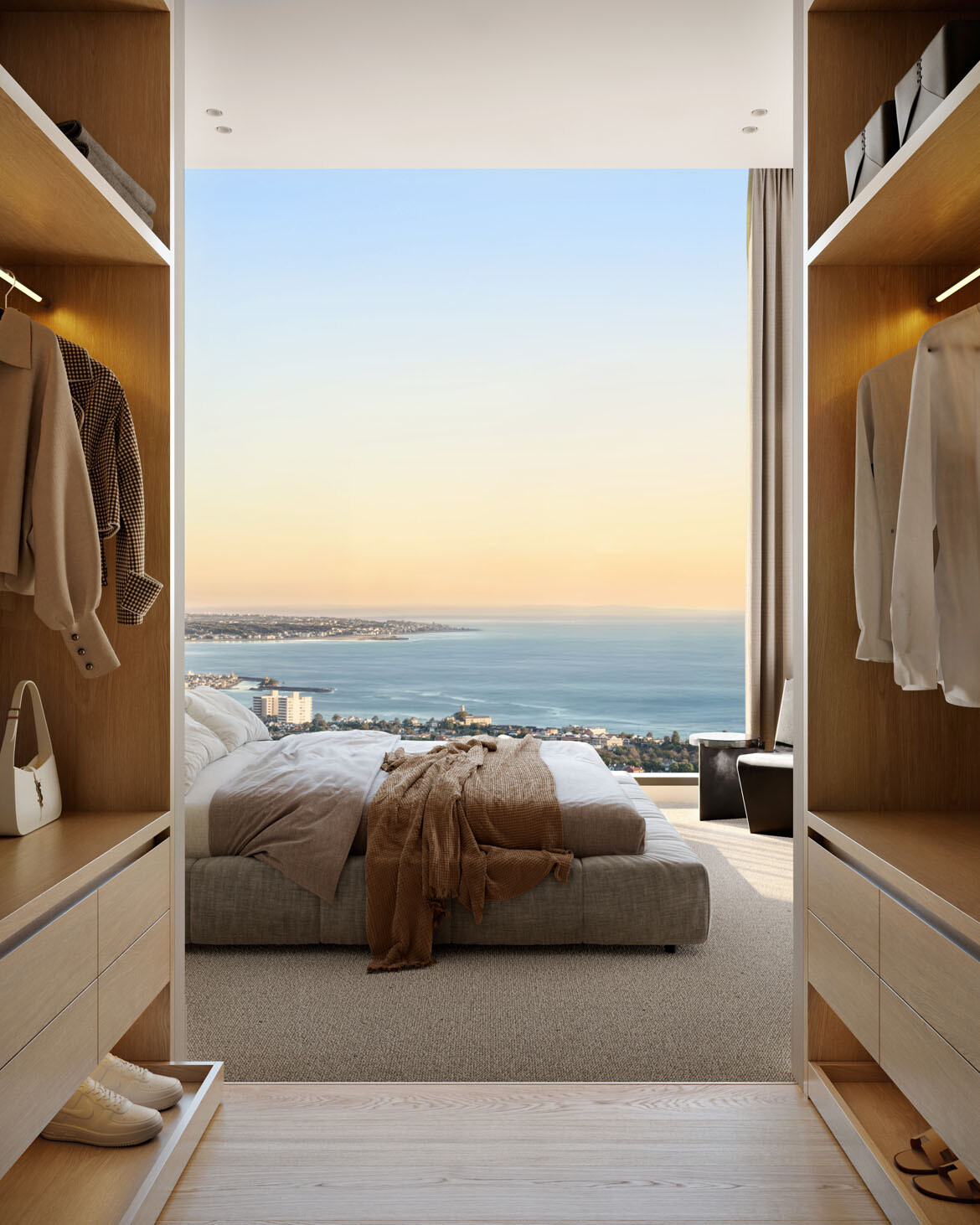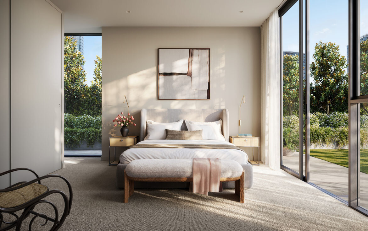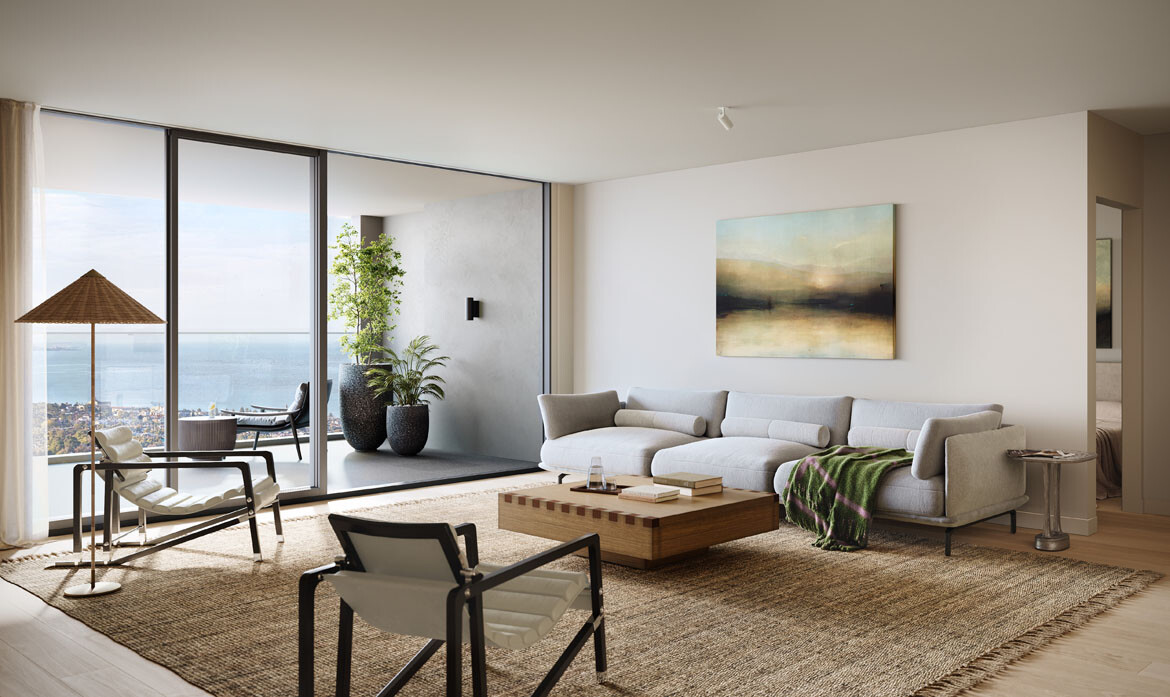 Expansive glazing draws daylight deep into apartments, reflected across pale timber flooring and crisp white joinery. The material palette is deliberately restrained to allow views prominence, while generous proportions and detailing enhance calm and openness. Every residence is designed for long-term liveability — intuitive layouts, ample storage and quality finishes that endure.