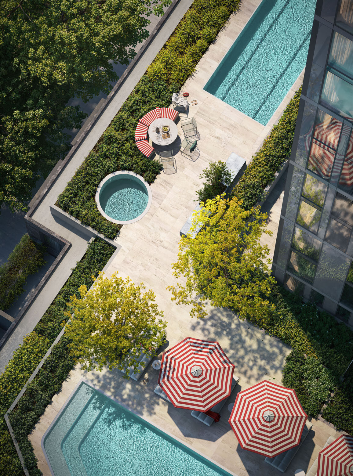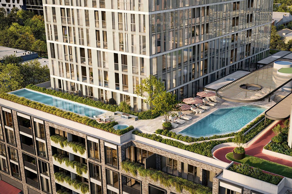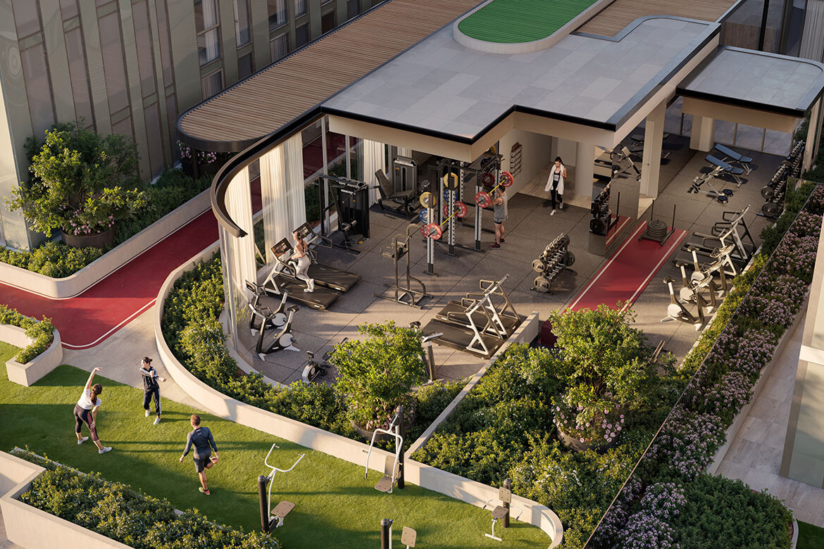 R.Evolution delivers more than 45 lifestyle amenities and facilities. The fifth level forms the precinct’s green heart — a one-acre landscaped rooftop by Paul Bangay OAM featuring lap pool, magnesium spa, saunas, outdoor gym, BBQ areas, dining pavilions and children’s play space. Wellness-focused spaces include infrared therapy rooms, yoga and reformer Pilates studio and a sensory reset room. Additional amenities include communal living room, co-working areas, library, café, wine cellar, cinema, golf simulator, 24-hour concierge and dedicated dog spa.