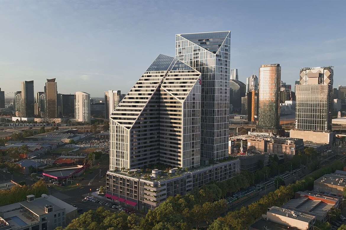 Urban renewal projects often promise transformation but deliver sameness — generic towers stacked above formulaic retail, wrapped in the rhetoric of community without the substance. R.Evolution, the final stage of Plus Studio‘s nine-year masterplan for R.Corporation’s R.Iconic precinct in South Melbourne, takes a different approach. The 40-storey tower, currently under construction on Normanby Road, concludes a landmark story of urban renewal grounded in materiality and sustained commitment.