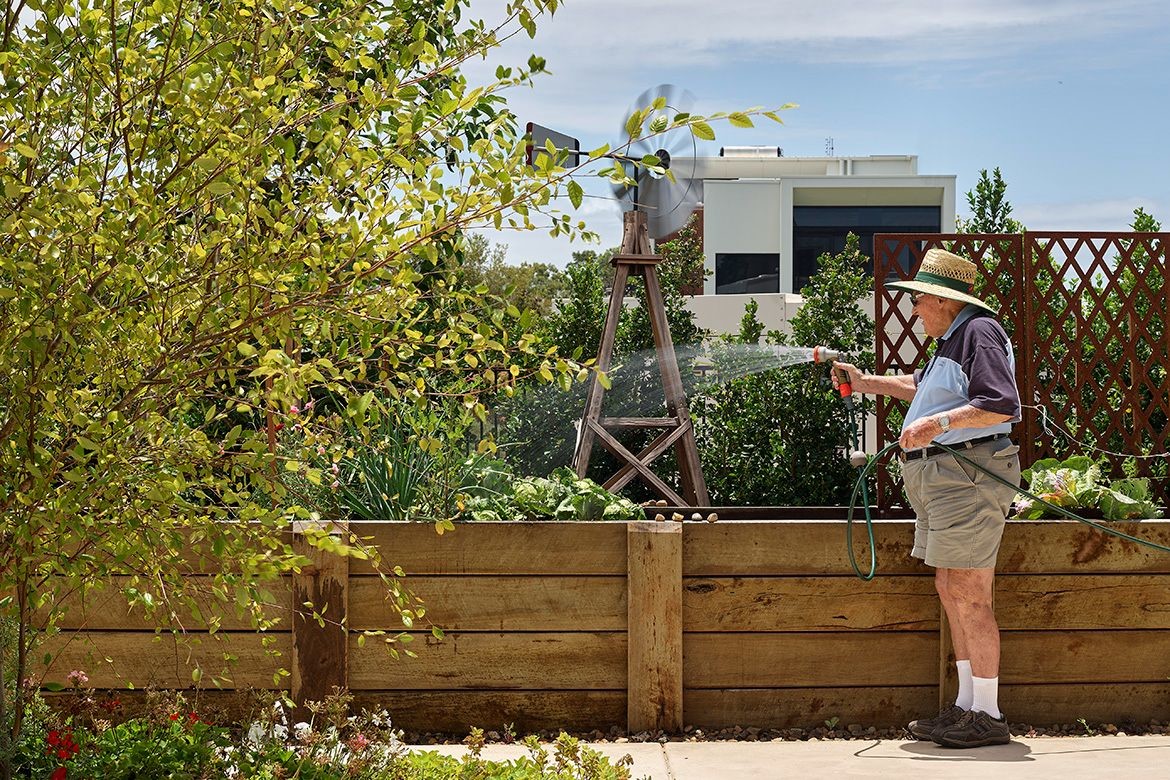 At Estia Health Aged Care in Maroochydore by ClarkeHopkinsClarke Architects (CHC), residents tend an edible garden, photography by Scott Burrows.