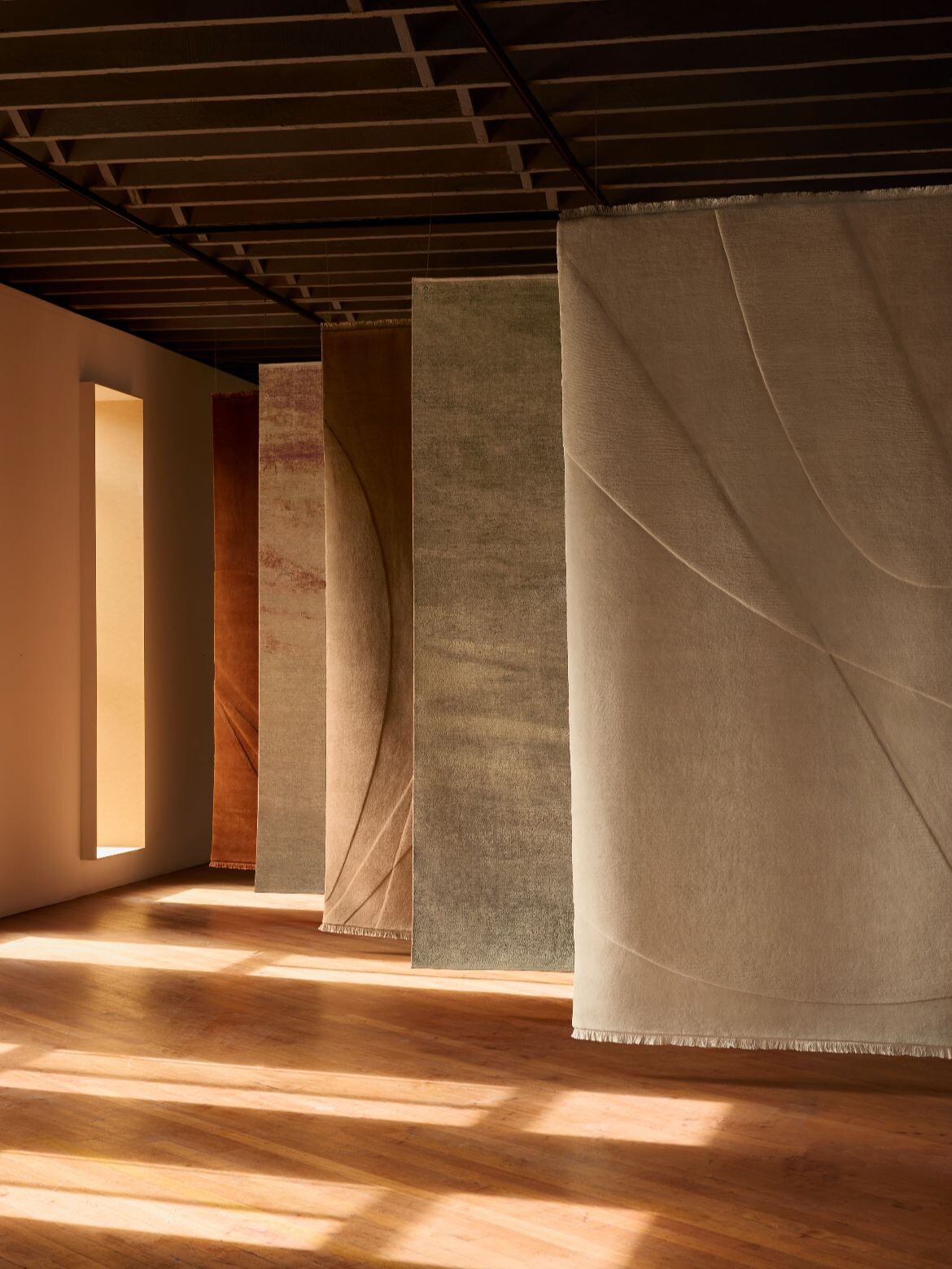 Three hand-knotted series anchor the collection. Marea features undulating wool pile heights intricately hand-carved to achieve smooth gradients, inspired by tidal patterns. Alma uses an ultra-low pile silk and wool blend that undergoes an oxidation process producing unique tonal variations, ensuring each rug is one-of-a-kind. Cirrus introduces pillowy wool piles rising above a lower base in organic banded rhythms.