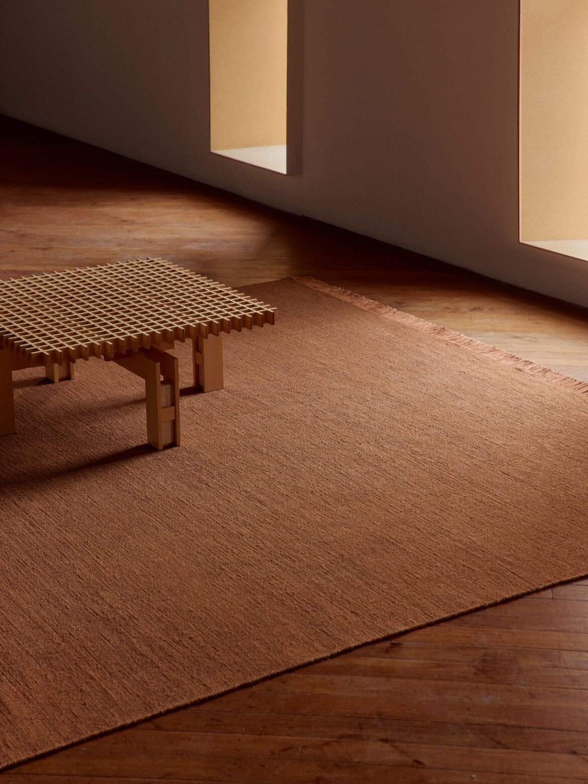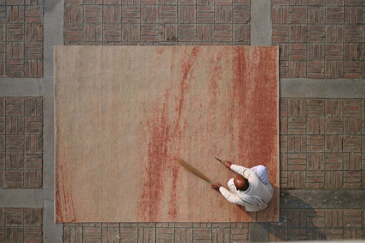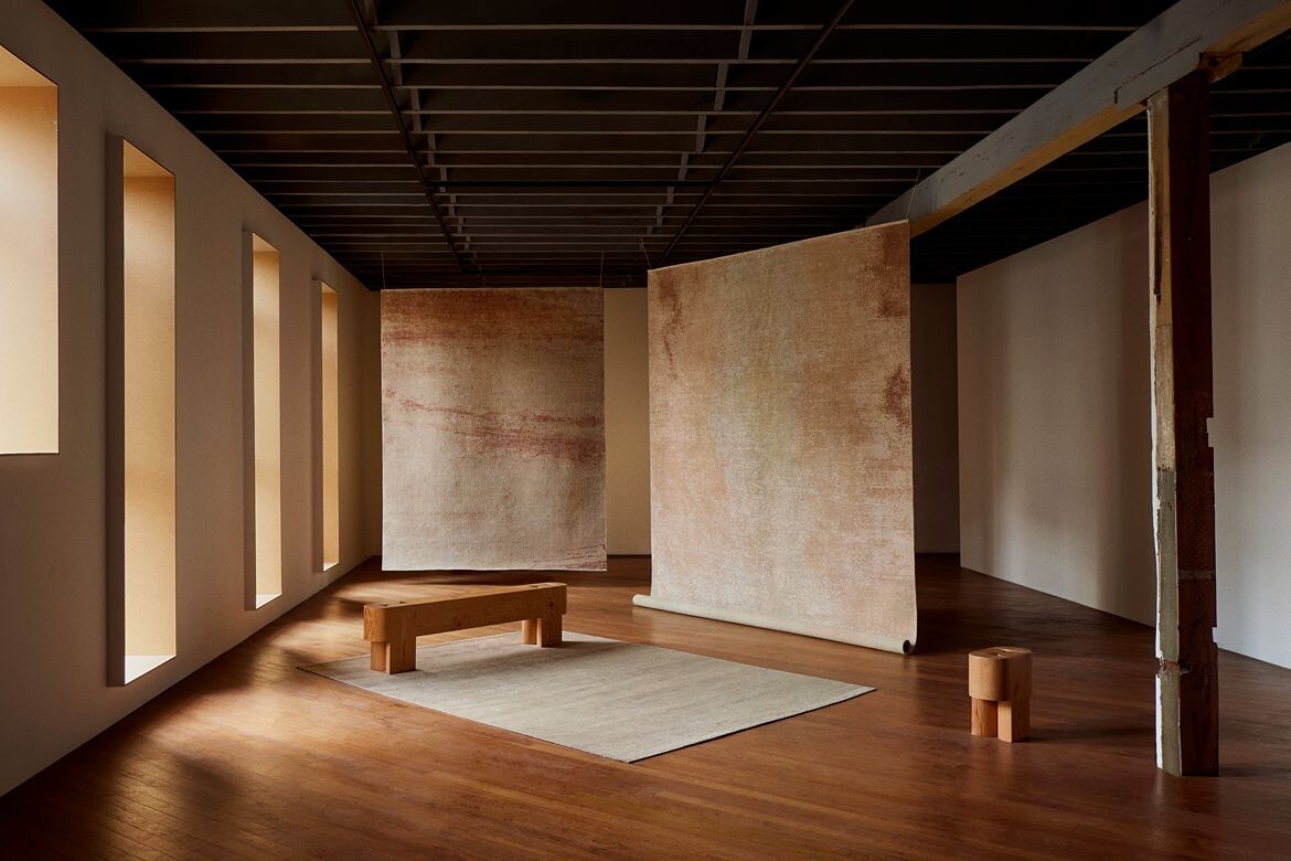 The collection translates Cascales Alimbau’s terracotta-washed paintings and poured resin forms into woven pieces using hand-knotted and flat-weave techniques. Each design evokes what the brand describes as the transient cycles of nature – from erosive wind and salt to the influence of sun and clouds. The color palette draws from earthy pigments including ochre, ivory and terracotta.