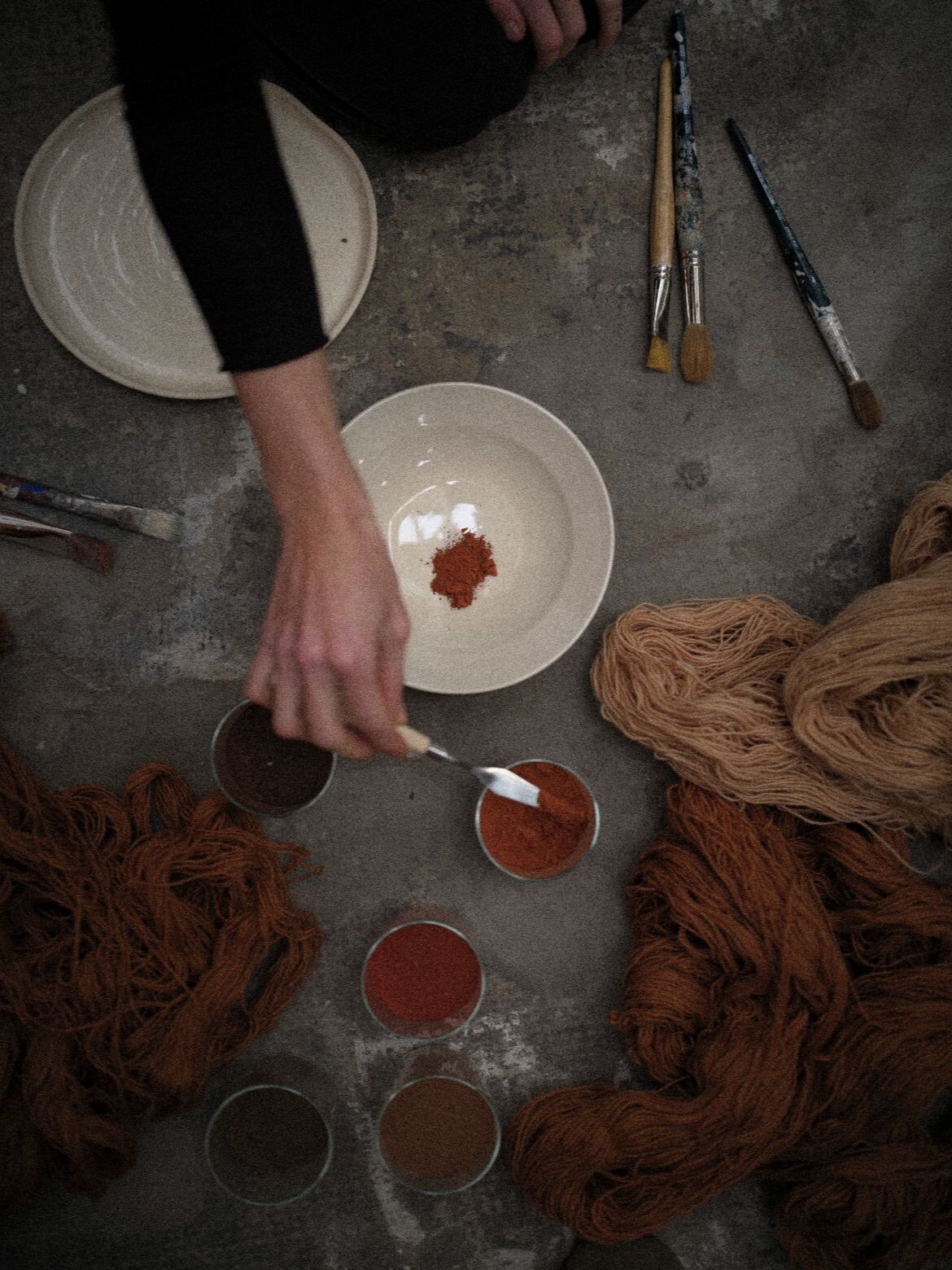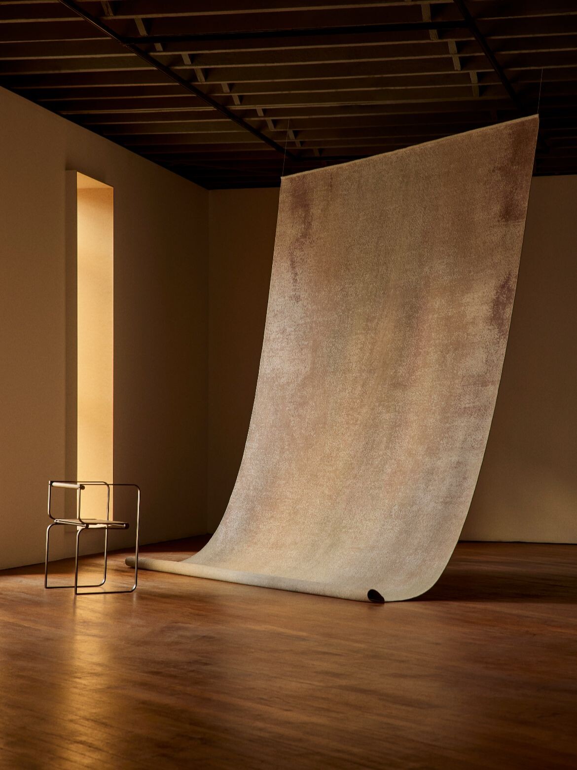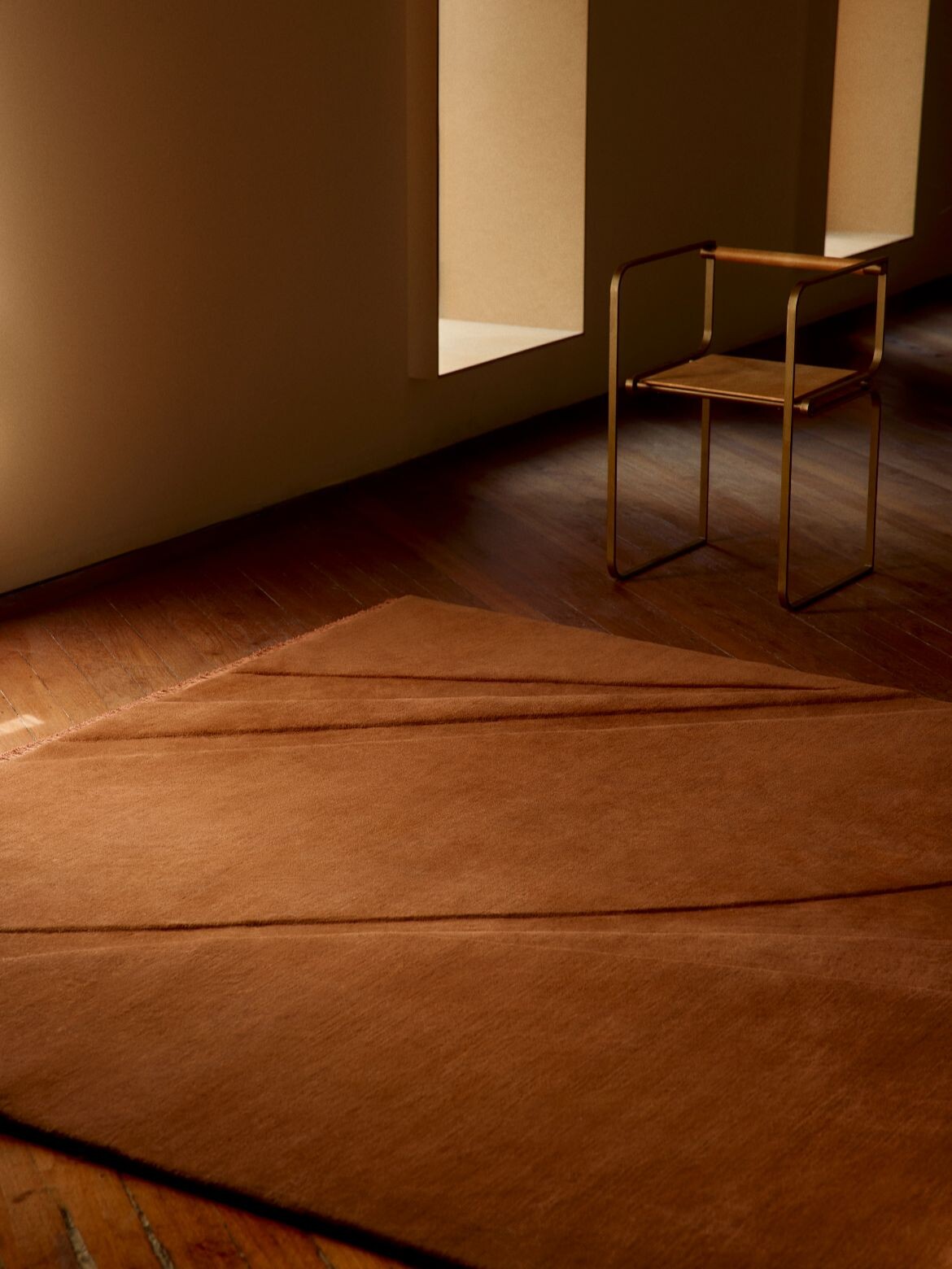 The collection translates Cascales Alimbau’s terracotta-washed paintings and poured resin forms into woven pieces using hand-knotted and flat-weave techniques. Each design evokes what the brand describes as the transient cycles of nature – from erosive wind and salt to the influence of sun and clouds. The color palette draws from earthy pigments including ochre, ivory and terracotta.