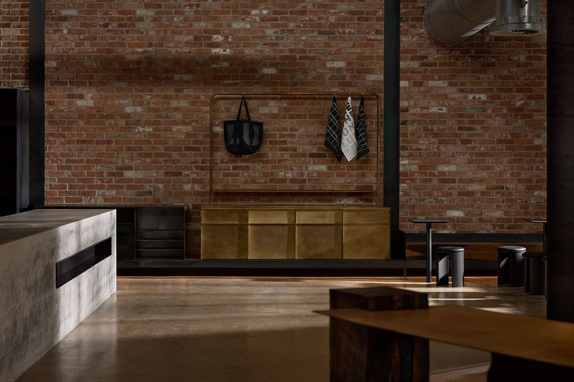 Murphy’s award-winning work on Lune Rosebery showcases the new Sydney flagship for the celebrated bakery, Lune. Designed by emerging studio In Addition, the space balances heritage architecture with contemporary design interventions. The dramatic arched entry, ebonised vestibule walls and glass cube interior set the stage for an immersive visitor experience. Murphy’s photography emphasises the dialogue between the Brutalist concrete counter, sculptural brass bar and heritage bones of the original building, highlighting how materials and light shape perception.