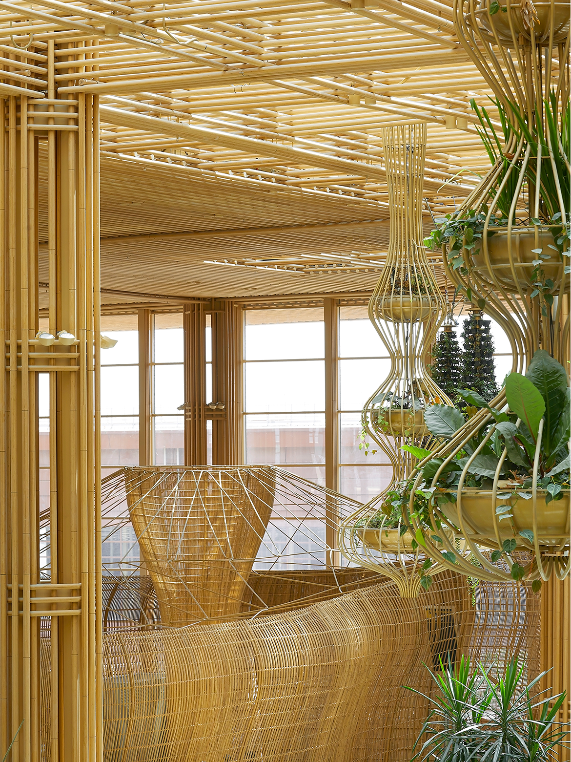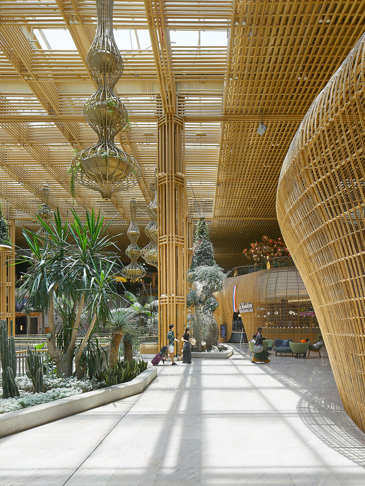 The departures area integrates retail, hospitality and relaxation zones, offering a cohesive experience where structure and surface merge into one continuous expression. The rattan’s warm hues and organic geometry soften the monumental scale of the airport, bringing a sense of calm and connection to the natural world.
