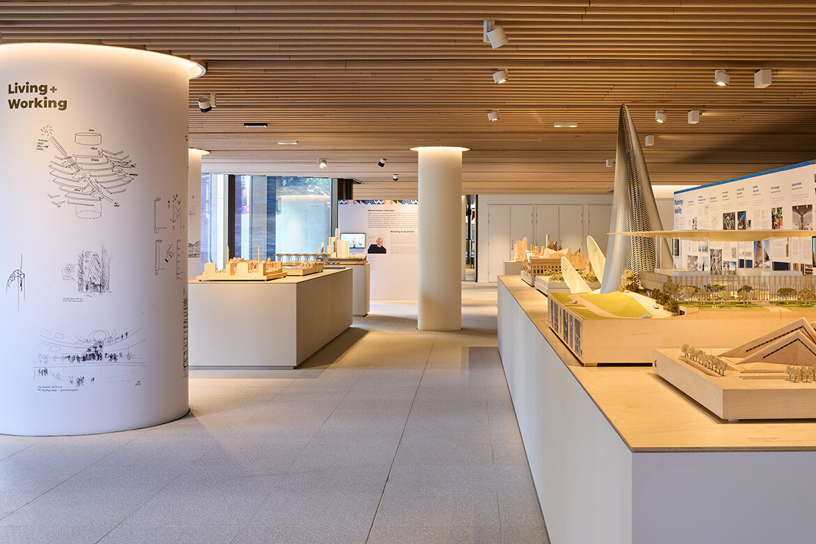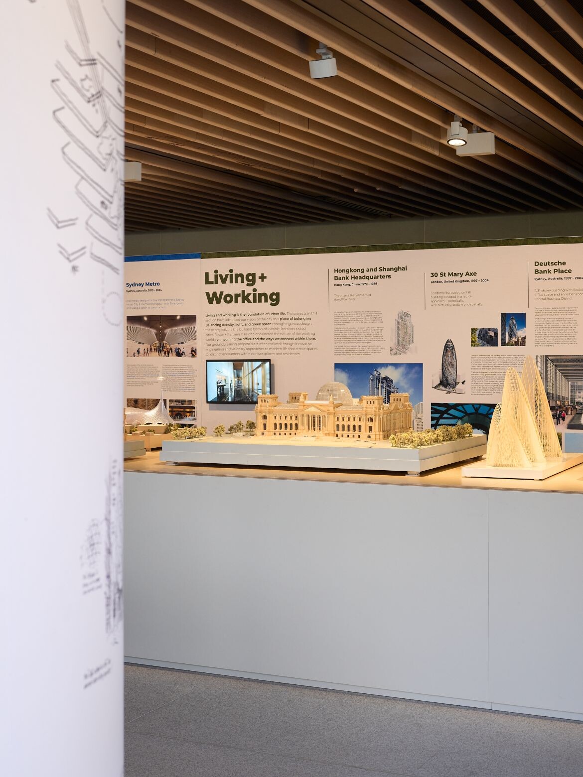 Organised across three thematic areas – Community + Culture, Living + Working and Planning + Mobility – the exhibition features Australian and international projects, including Deutsche Bank Place, Salesforce Tower at Sydney Place, Hong Kong International Airport, London’s ‘Gherkin’ and Berlin’s Reichstag. Early works are displayed alongside recent developments to illustrate the durability of the practice’s ideas and their adaptation over time.