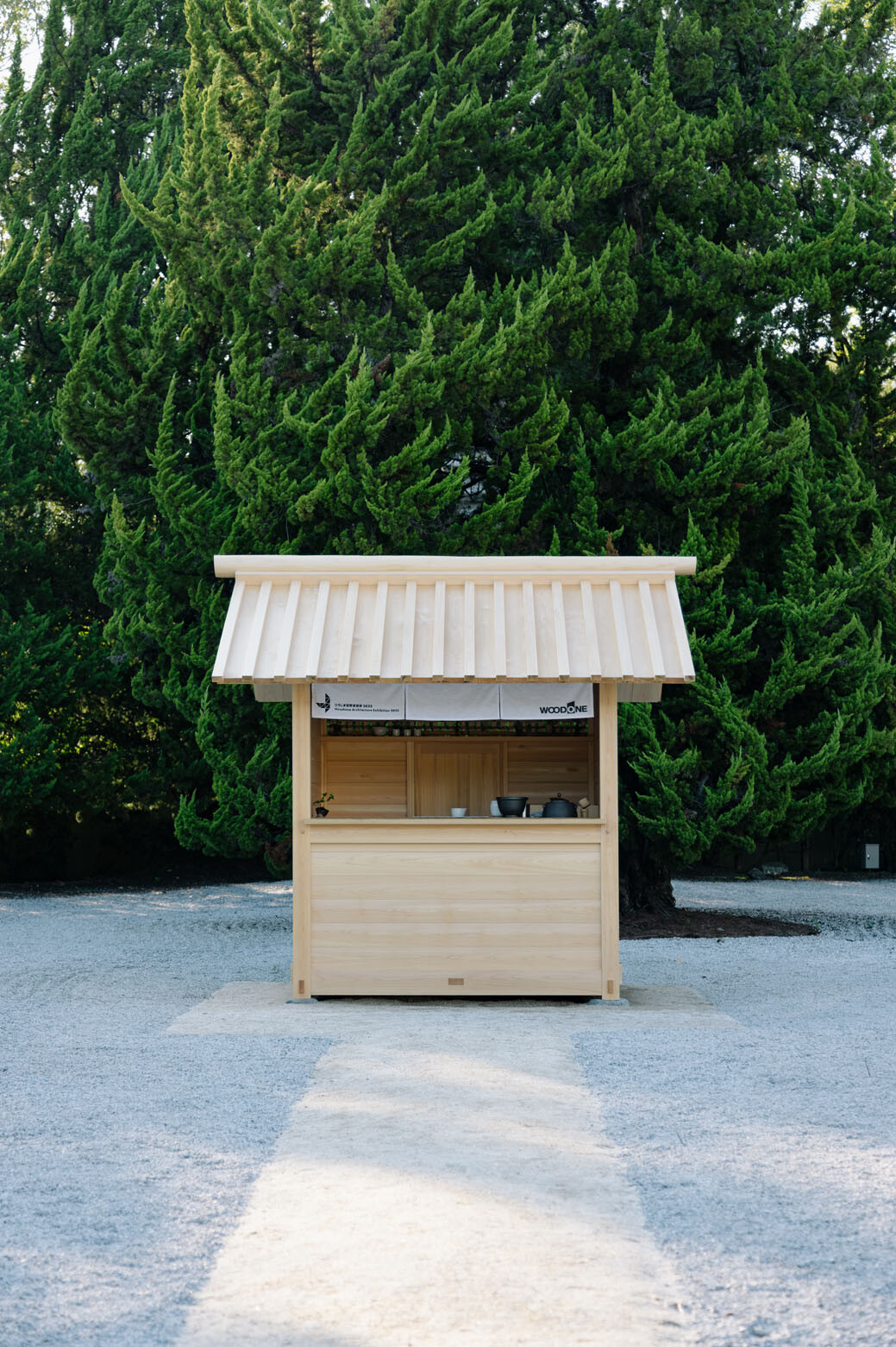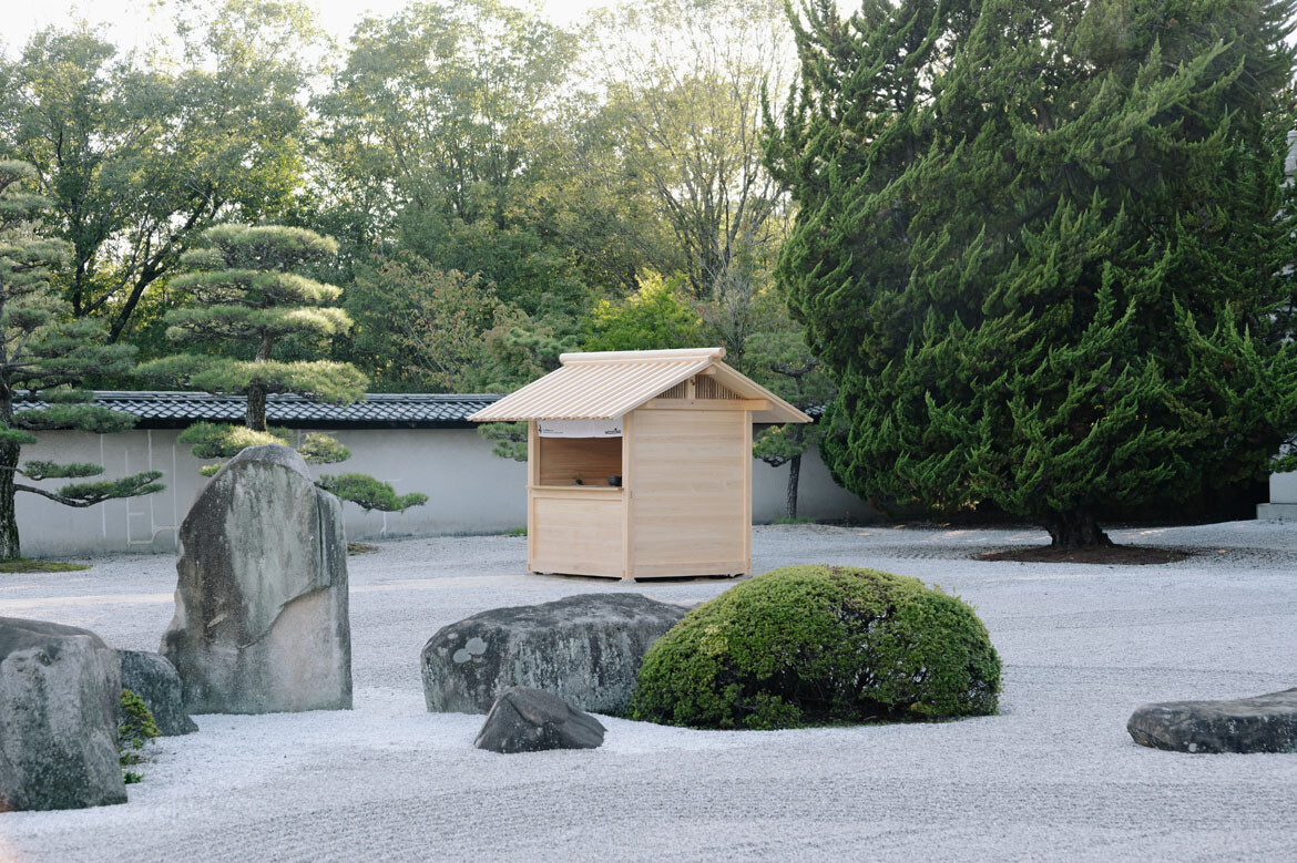 Yasushi Horibe, the founder of Hane Architecture Workshop famous for projects like Guntû – a luxury cruise plying the Seto Inland Sea – designed the kiosk. It is a small hut made of solid Yoshino cypress timber, and functions as a matcha stand, reached via traversing a path between the pebbles.