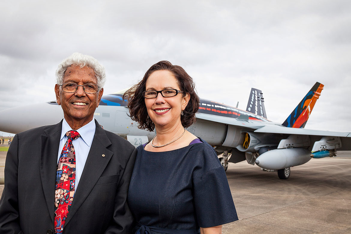 Left to right: Yanyuwa man John Moriarty AM and Ros Moriarty of Balarinji in front of the RAAF Worimi Hornet.