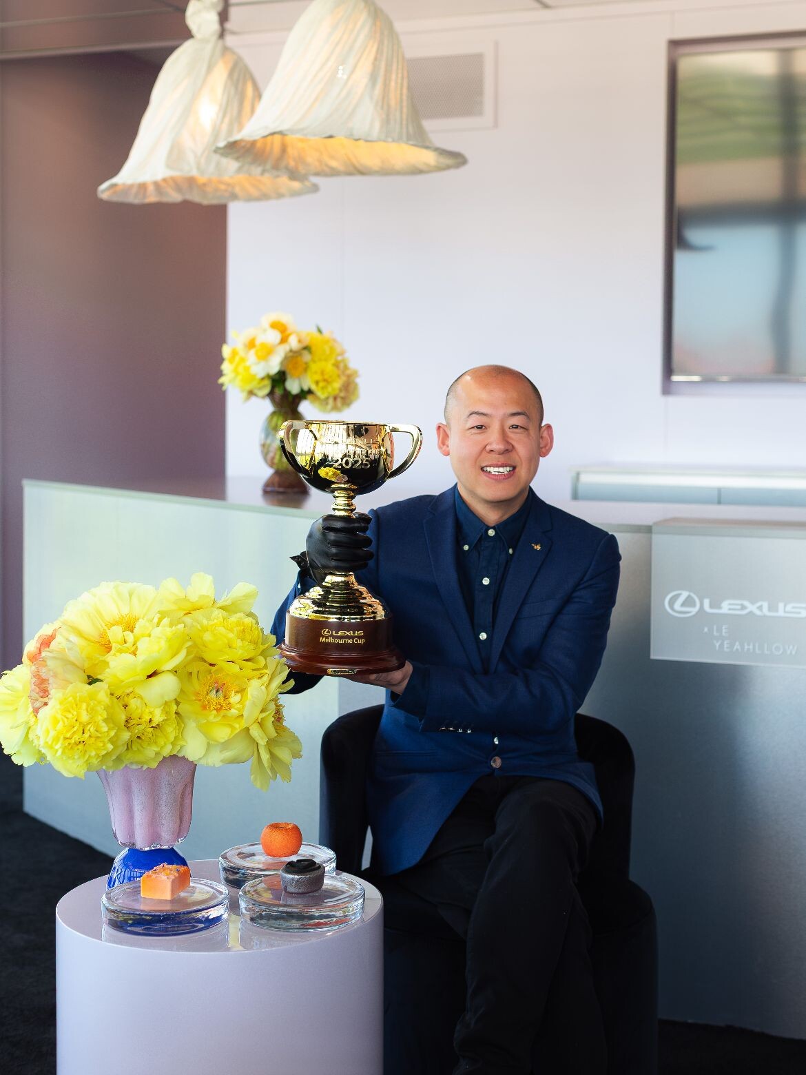 Large-scale collages by Melbourne artist and designer Simone Esterhuizen feature throughout, inspired by each race day’s traditional color – blue for Victoria Derby Day, yellow for Lexus Melbourne Cup Day, pink for Crown Oaks Day and red for TAB Champions Stakes Day. Florist Simone Gooch crafted Ikebana-inspired floral sculptures through the pavilion.