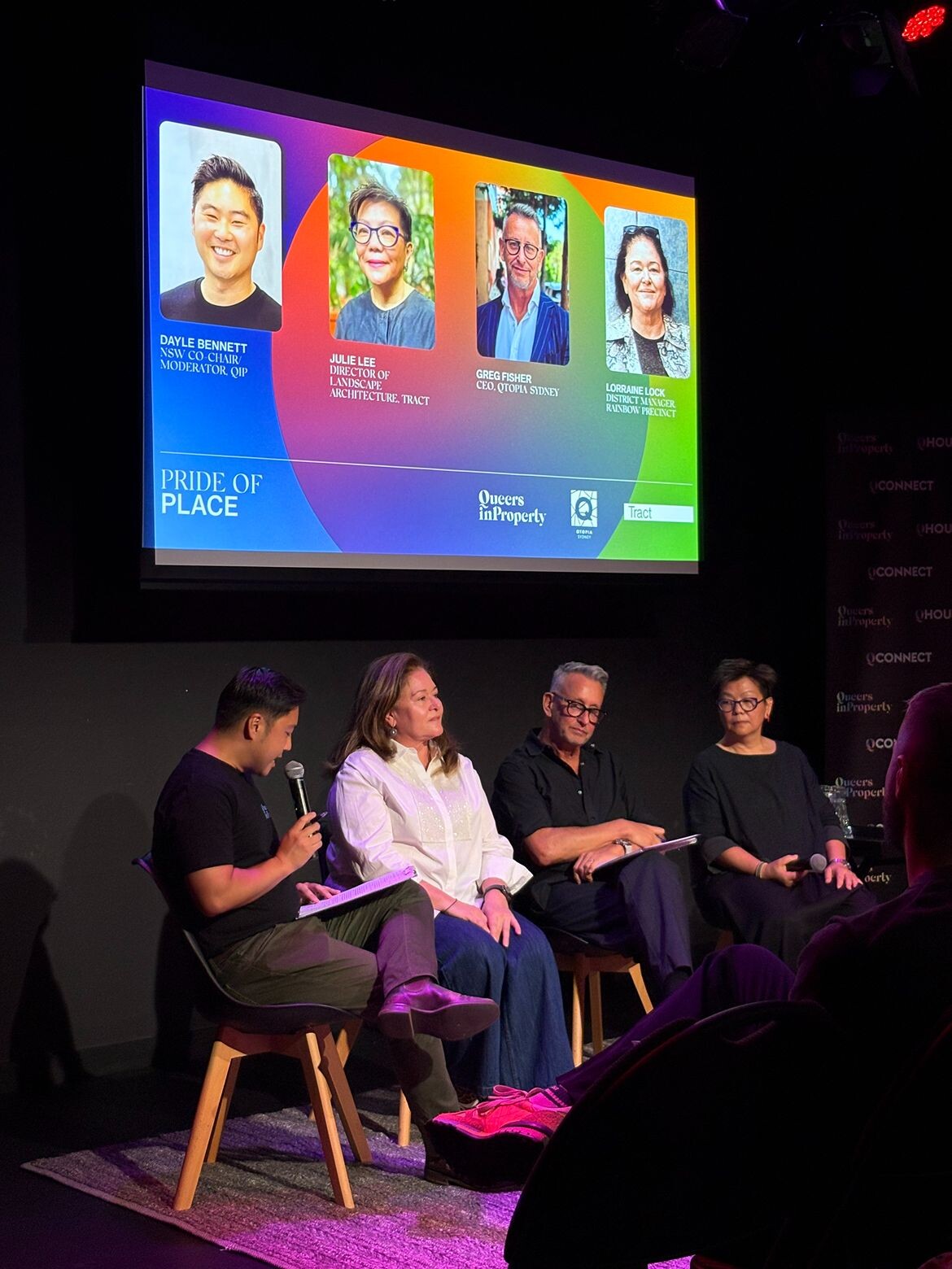 Hosted in a packed Loading Dock Theatre at Qtopia, the new Darlinghurst centre for queer culture whose three premises dominate Taylor Square, Julie Lee’s presentation was followed by a lively and insightful panel discussion. Moderated by Dayle Bennett, QIP NSW Co-Chair, the panel included Greg Fisher, CEO of Qtopia and Lorraine Lock from The Rainbow Precinct who joined Julie Lee to discuss not only Taylor Square as a place, but the broader community and precinct changes that will continue to transform the Oxford Street neighbourhood.