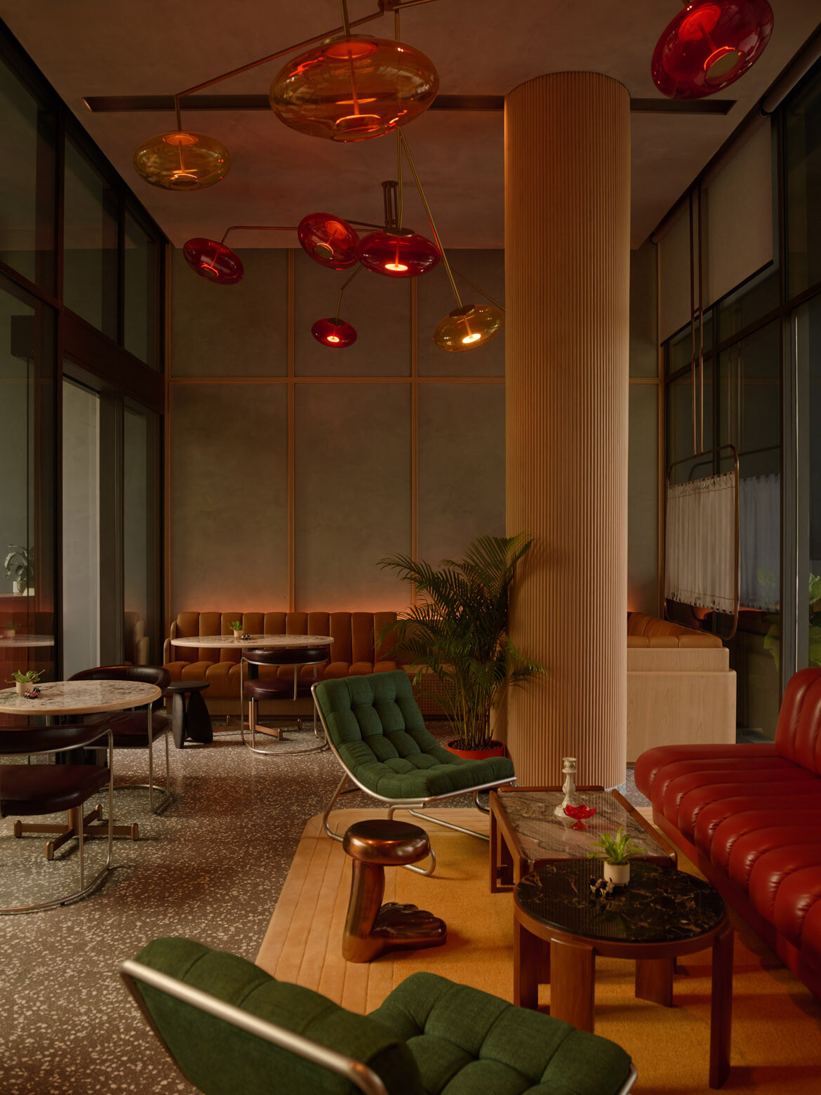To the right is Café Standard, a casual cocktail lounge with an alfresco dining area that overlooks a courtyard garden. From here, there are views of the immense stepped gardens beyond and at night the ambience is mesmerising. The interior is urbane, with beautiful timber cabinetry, marble and terrazzo in shades of green. All chairs, tables, lights and objects are bespoke, as is everything in this hotel.