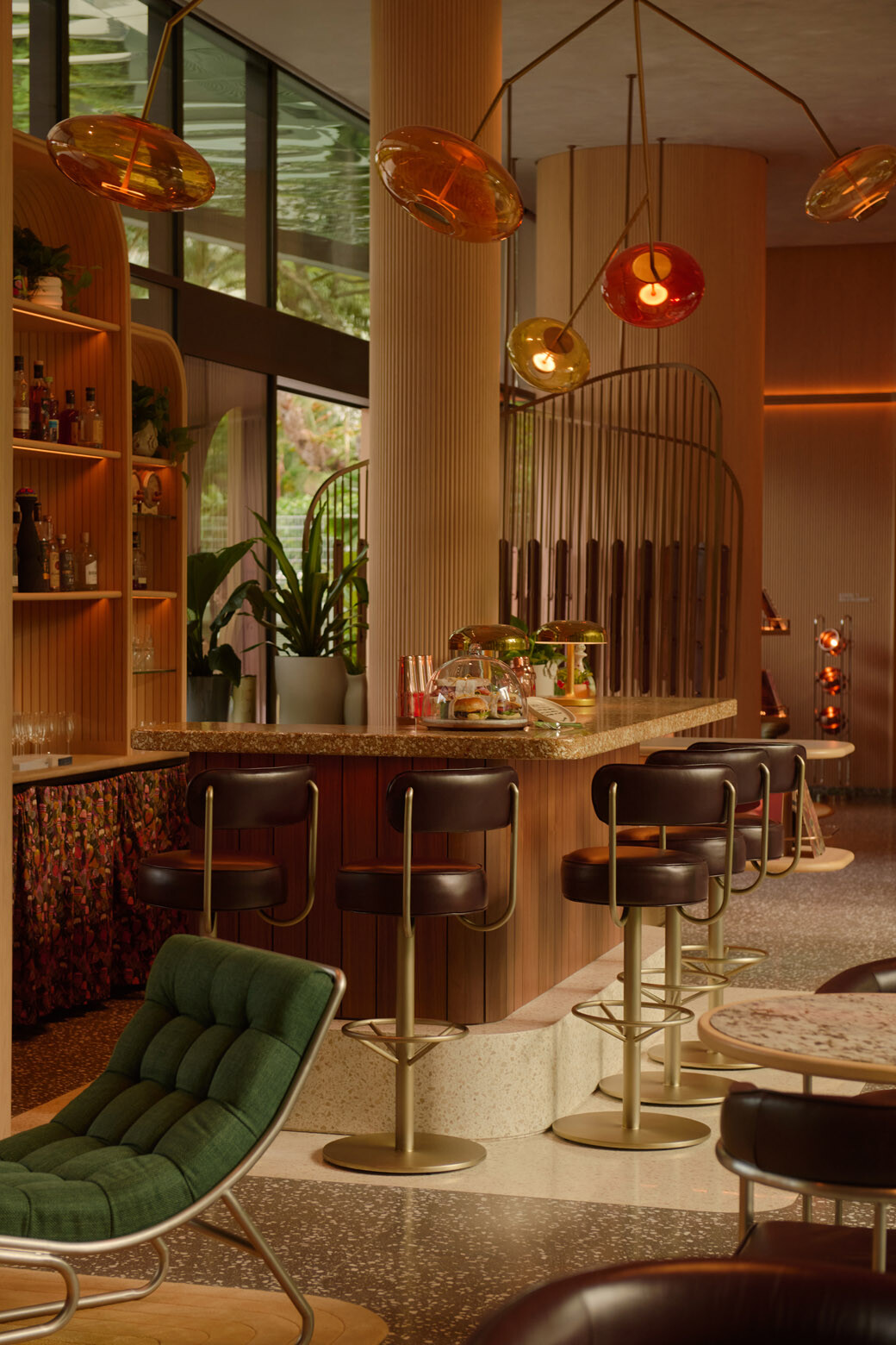 Materiality is authentic, with white oak and walnut timber, terrazzo, marble and glass all used to great effect. The base colour palette consists of light wood hues that become the backdrop to vivid pops of colour in lighting, furnishings, fabrics, tiles and wallpapers which create warmth and interest in every space. This is a project that embraces quirky details and playful inclusions and adds an element of the unexpected at every opportunity.