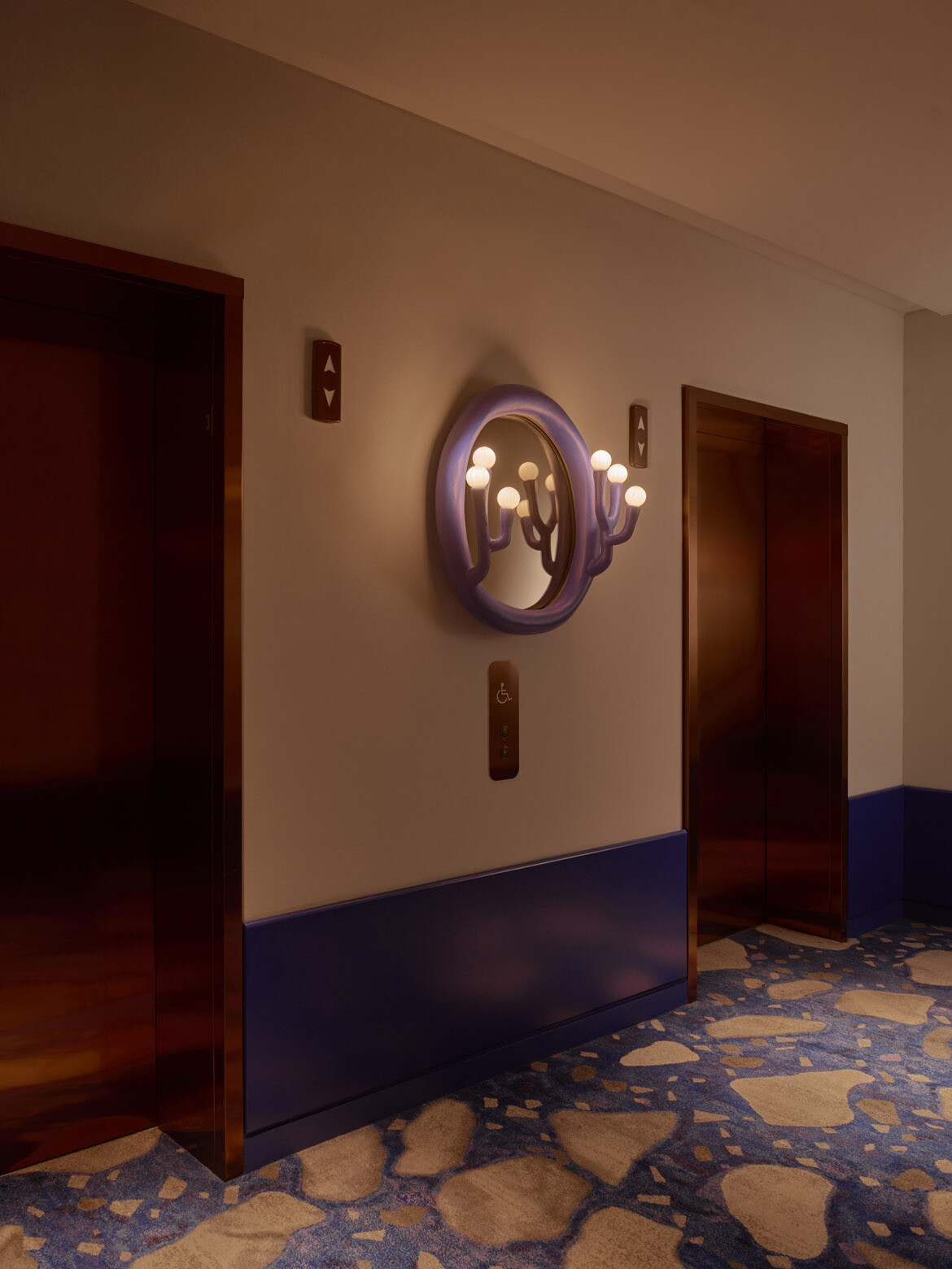 Up in those fabulous elevators to the guestrooms and on each floor, corridors are fitted with vibrant blue custom carpet designed to replicate terrazzo. Signage for the rooms, also created by MOD, is discreet and modern.
