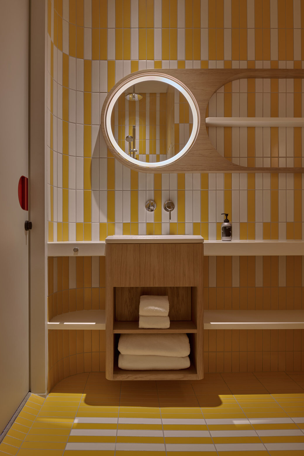Within the rooms and suites there is a consistent language through the furnishings, facilities and use of the colour lemon, with some minor changes depending on the size, type and position of the room. However, an integral feature is a timber canopy that rises from the wall to the ceiling and curves overhead to frame the bed. Set against white walls, this is such an impressive addition and creates a focal point that makes the design singular.