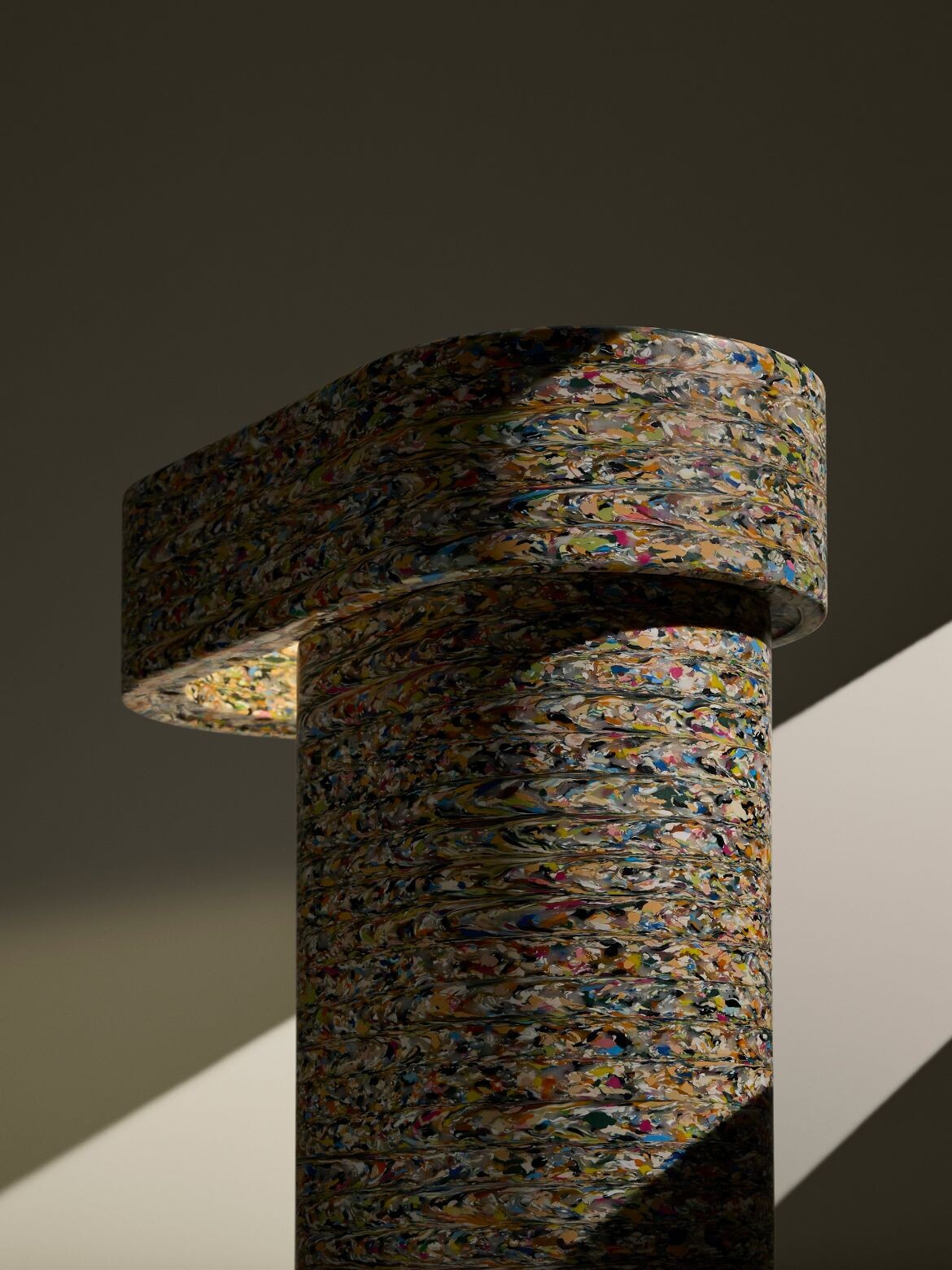 Lighting has also become an important part of the studio’s output. MASS, a table lamp originally produced in timber, was conceived as a sculptural object emitting ambient light. Seeking to extend the concept, du Toit collaborated with Defy Design to produce the lamp in recycled plastic, elevating the material through considered form and finish. Each piece remains unique, shaped by variations in the recycled material.