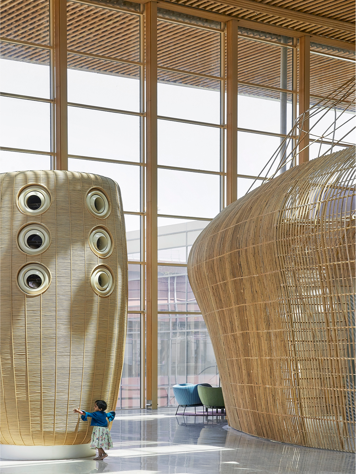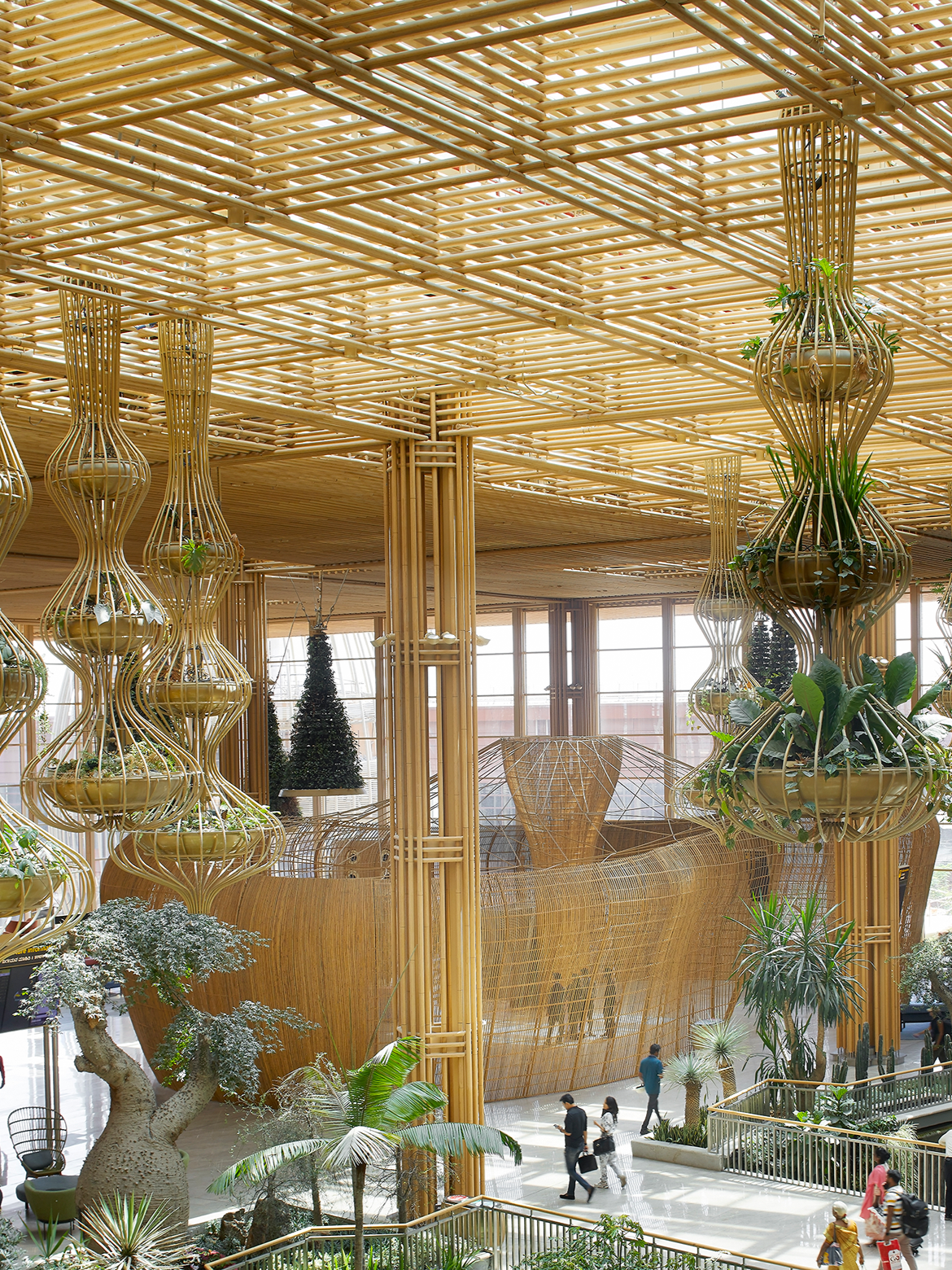 The Terminal 2 interiors at Kempegowda International Airport represent the most ambitious expression of this thinking to date. Spanning approximately 12,000 square metres, the Departures Hall is defined by vast, flowing rattan pods that replace conventional walls and signage with an intuitive, nature-inspired journey.