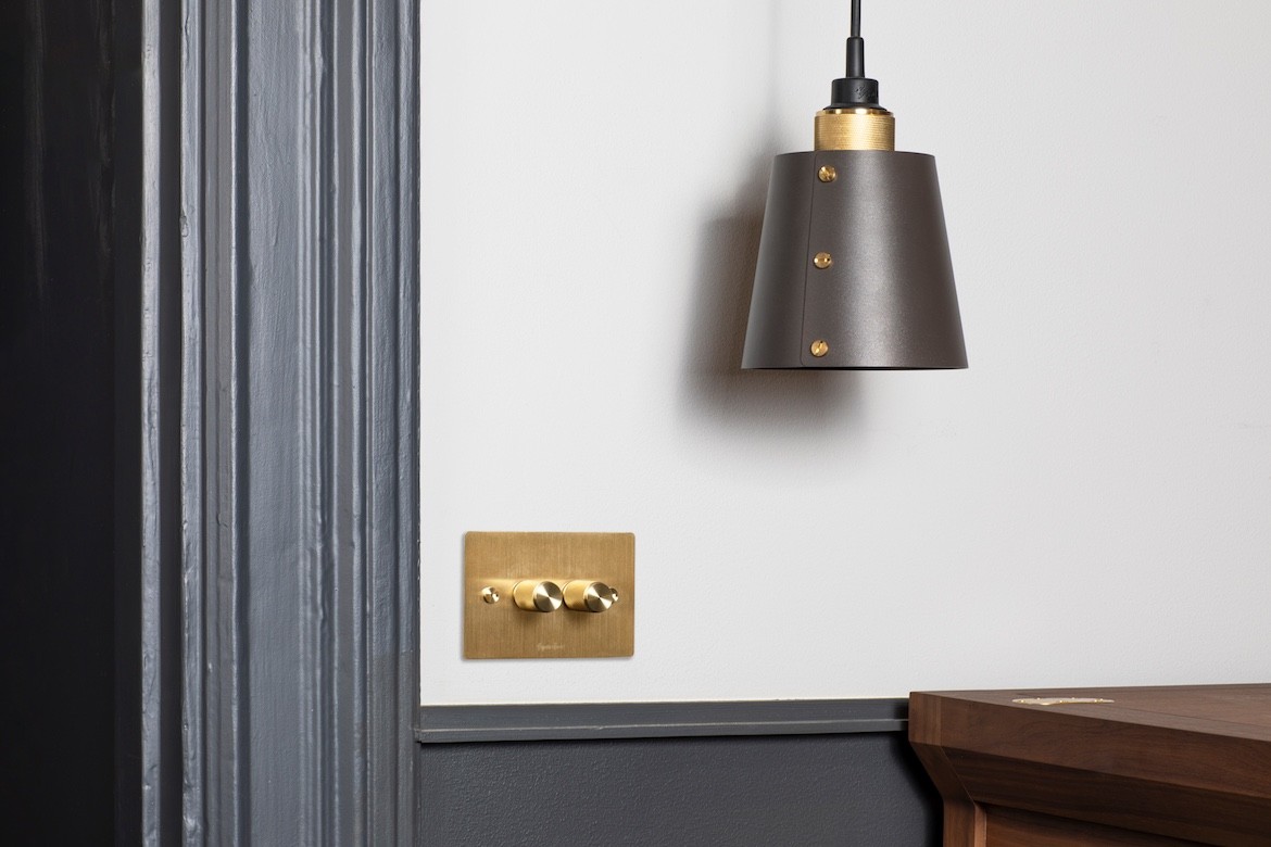 The hardware comes in matte black, glistening brass or smoked bronze finishes, and sturdy coin screws in line with the switches give a robust and somewhat mechanical appearance.