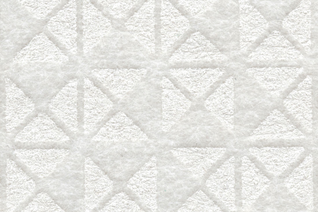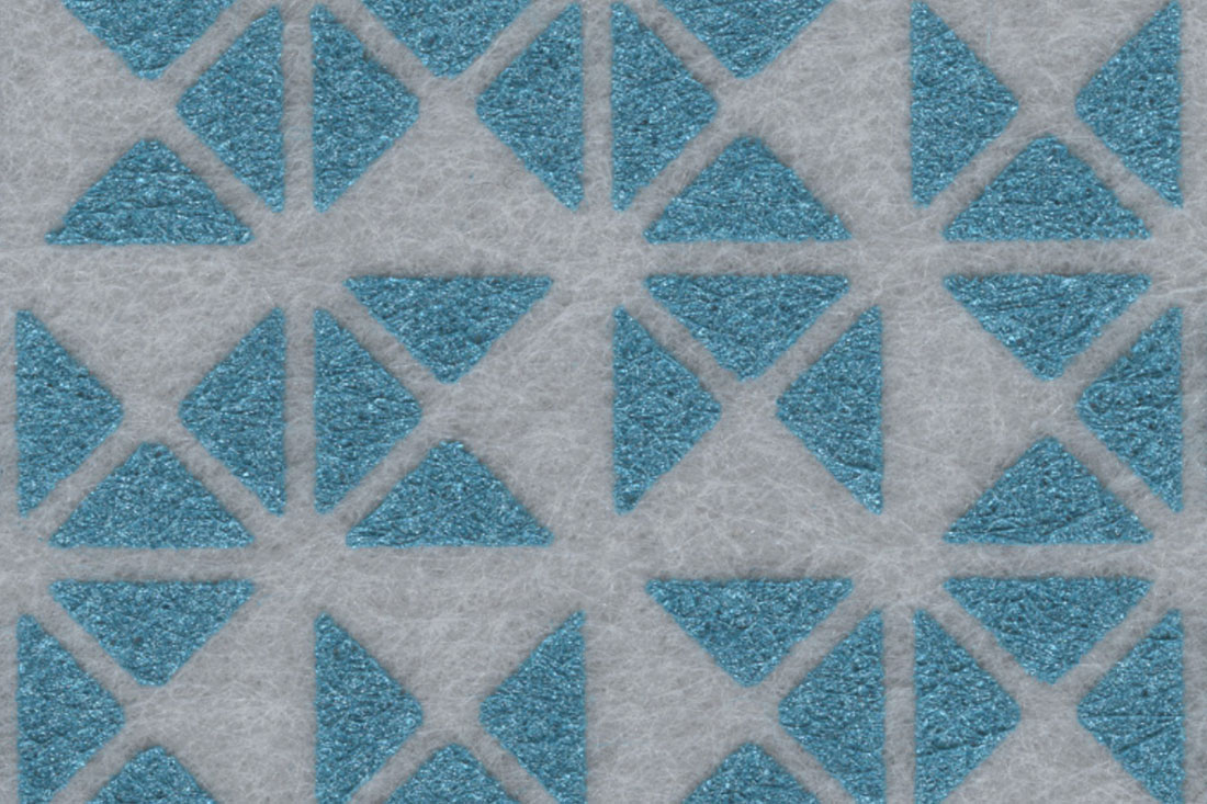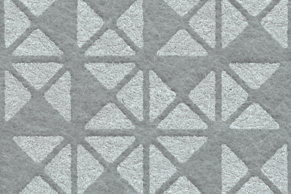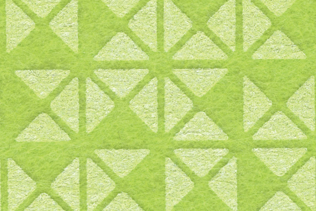 Trio is a double sided, one colour print on 12mm EchoPanel. The design is made up of a single triangular shape that is repeated and rotated to form an angular motif that is then repeated and rotated across the panel.