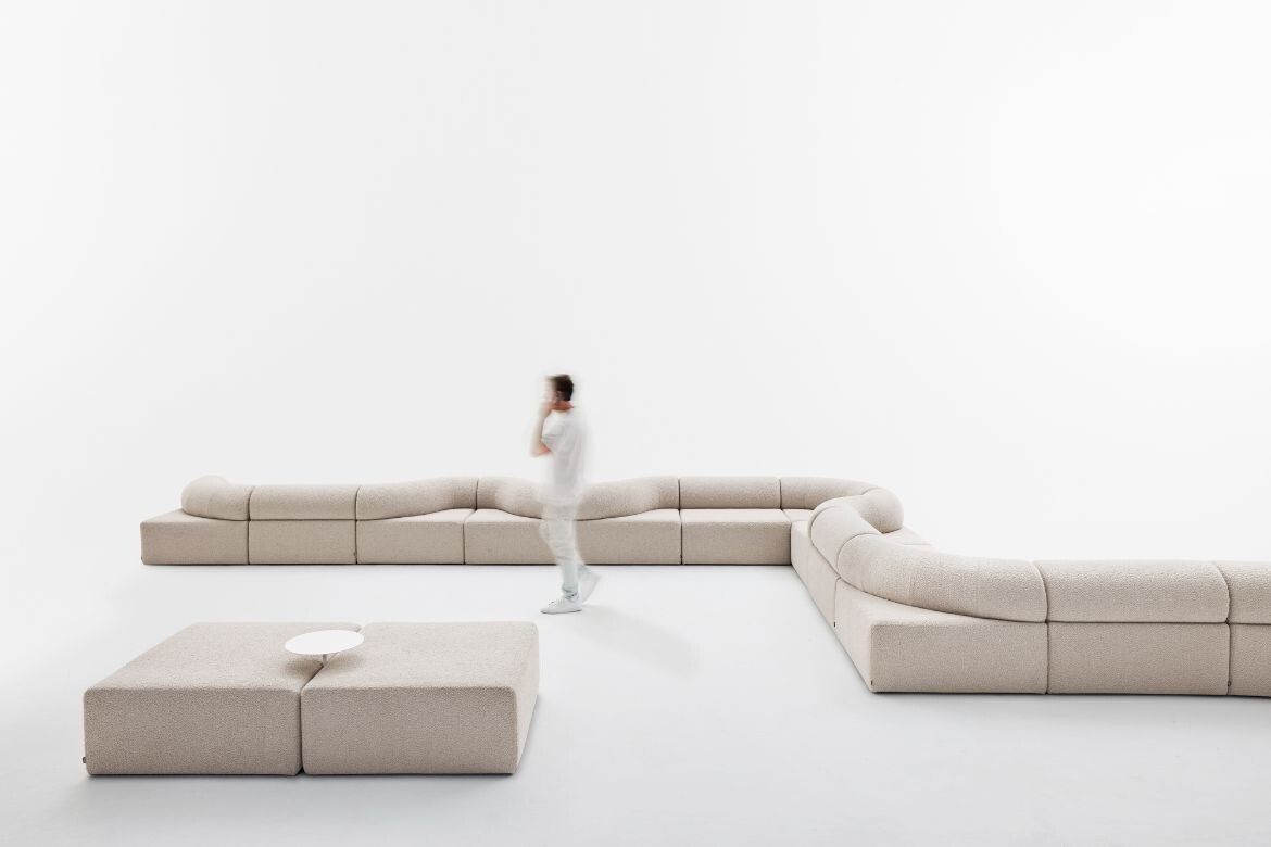 At a generous 1x1meter the base proportions are large enough for the lounge to hold its own in any commercial space. Moreover, the large format means the small corner separated out of the lounge when a curved element is chosen remains large enough to be used as a seat and has an expressed geometric presence. That said, reduce the number of elements and the lounge can just as easily suit a domestic space. This is something Lotersztain and his team have considered with various options available to tailor the lounge to specific needs. The simple forms allow the whole to be reconfigured as needs change.