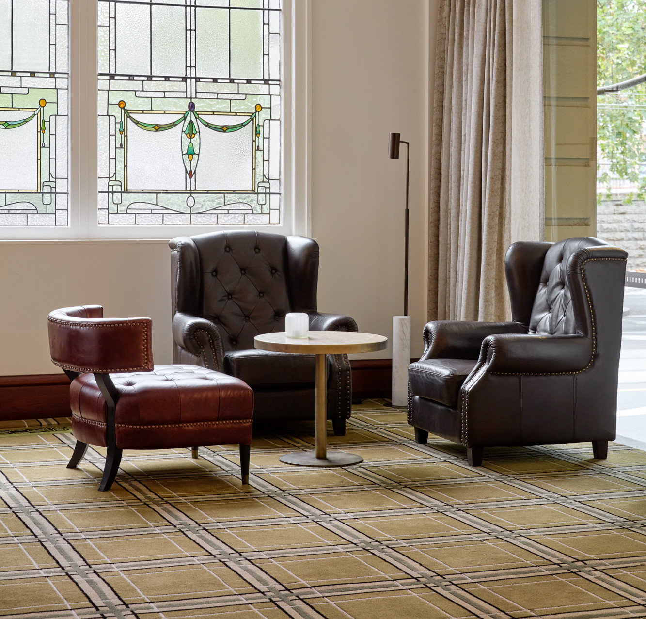 The design practice was engaged to enhance the beauty of the heritage features while maintaining the integrity of Rendezvous Hotel’s elegant branding. The resulting interiors create a signature style, with FYBER’s (previously Tattoo Dezign) carpets playing a prominent role in bringing this unique aesthetic to life.
