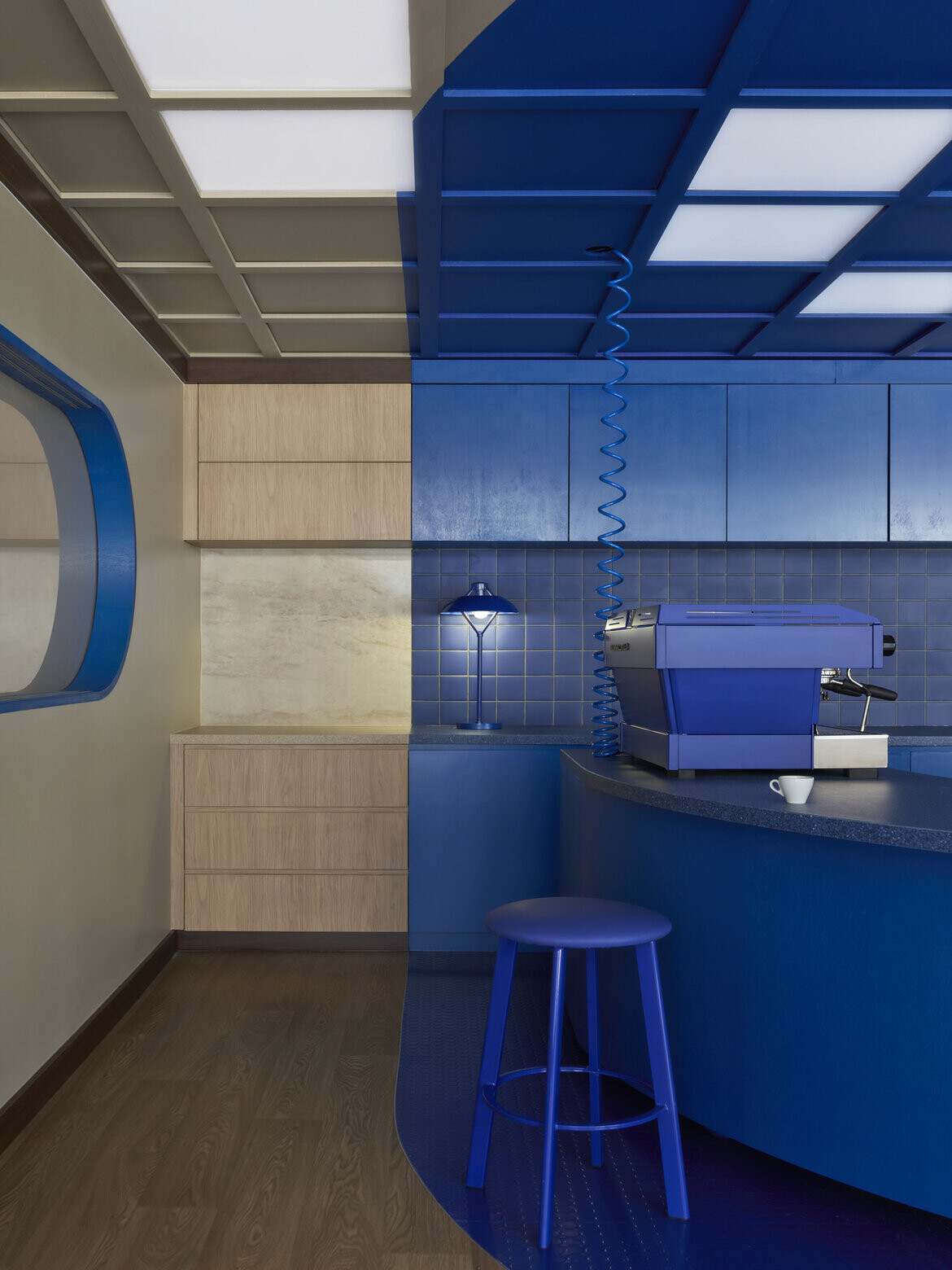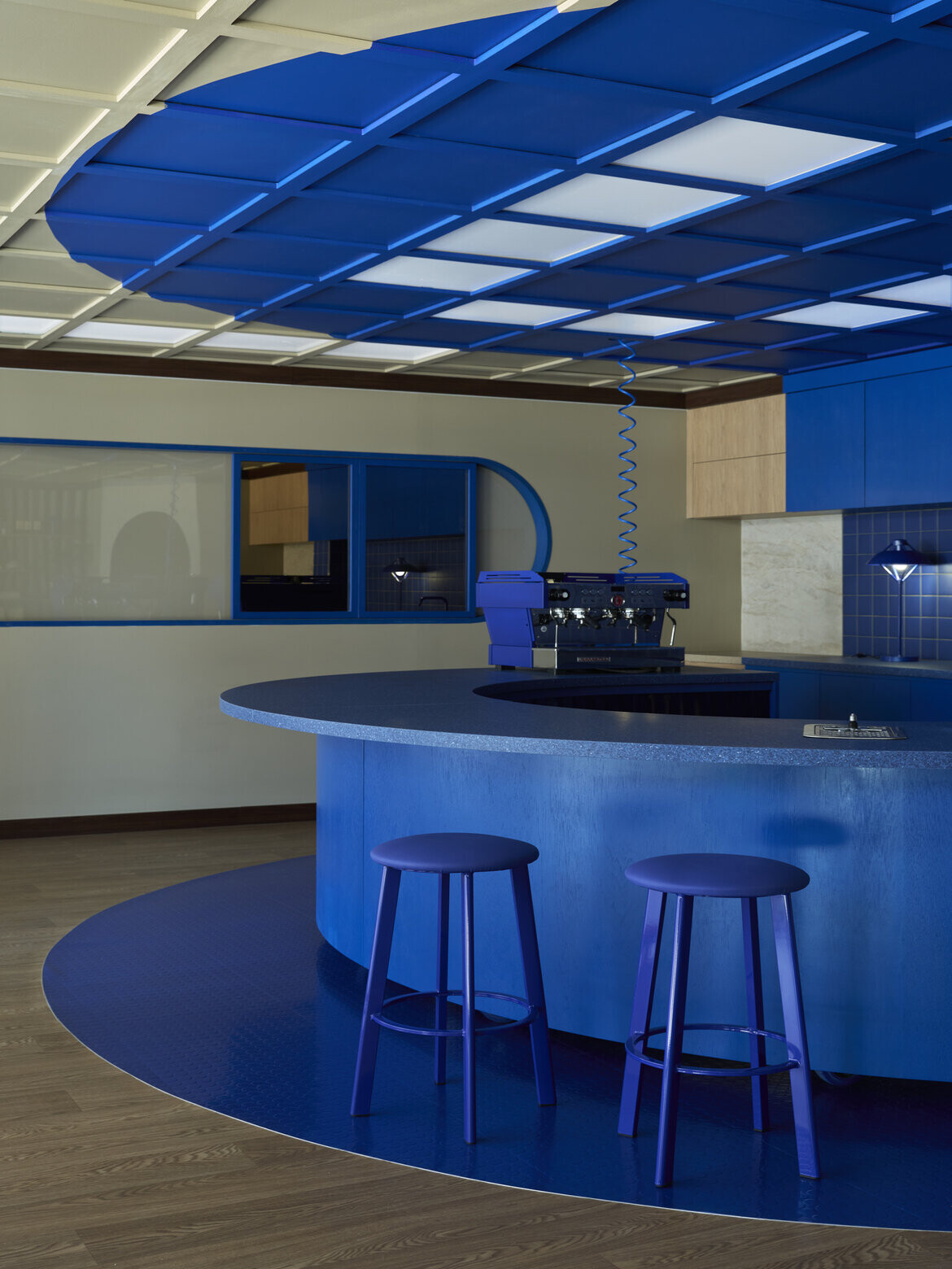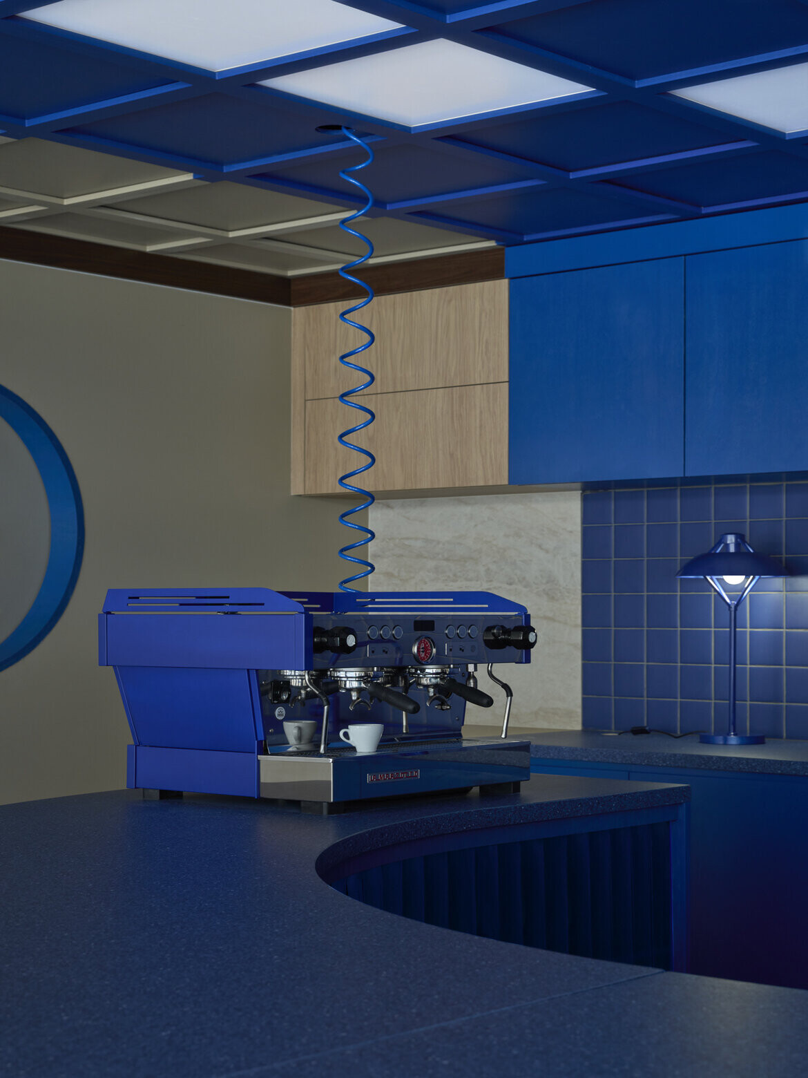There were some challenges on the design journey such as low ceilings and supplying water and power to the middle of the floorplate, but Kossen had a solution for both. Embracing the ceiling height, the designer has created an extruded grid system of LED panels in beige with the focal area painted in blue to reflect the form of the station below. In order to bring power and water to the middle of the space Kossen designed a spiral, extendable spine that emanates from the ceiling to the coffee machines that can be connected, disconnected and extended to any area of the room as required.