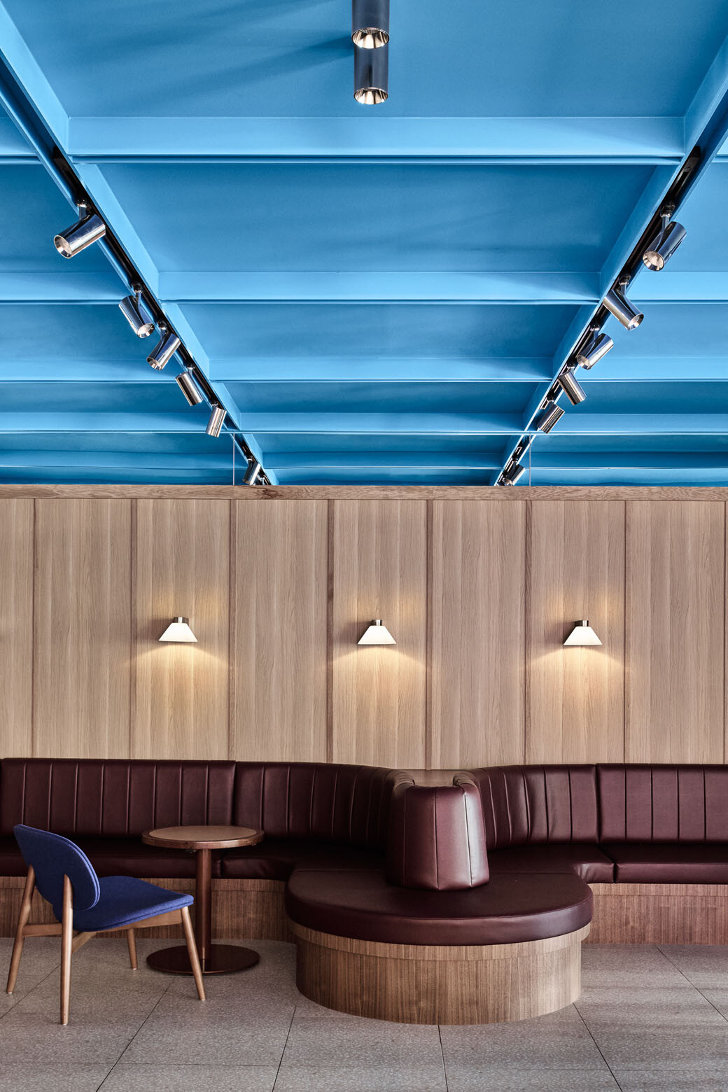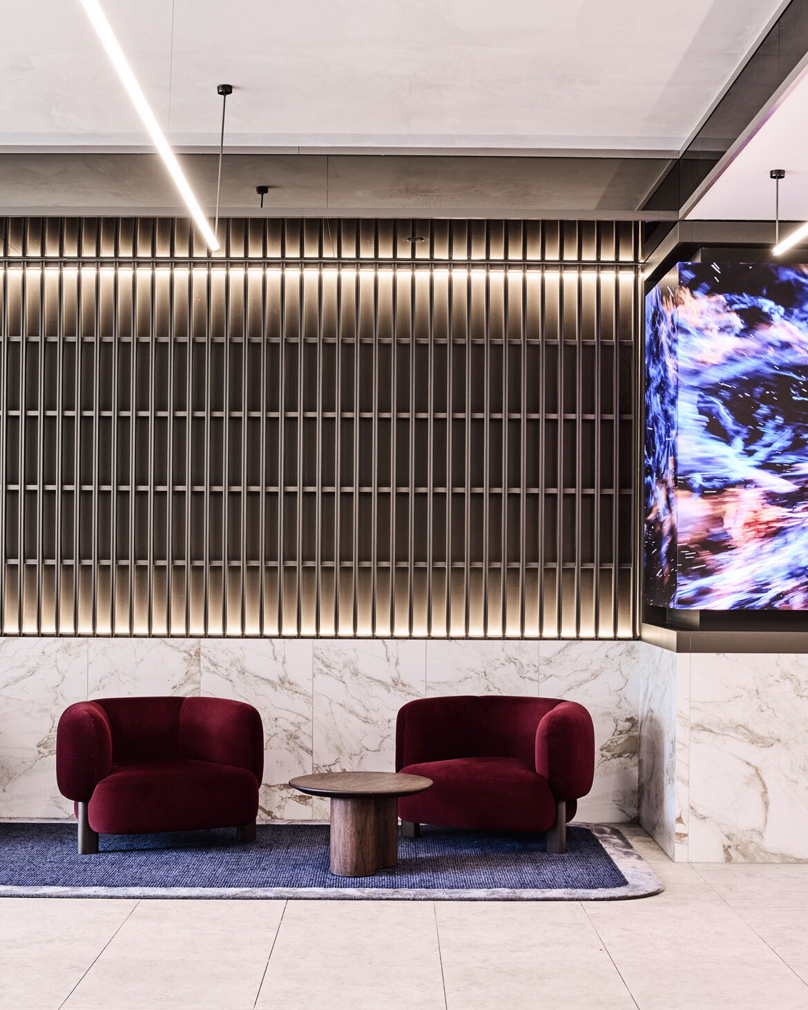 To enable the transformation of 440 Collins’ lobby, the design team drew on a palette that was dynamic, yet also restrained in terms of the number of materials and finishes used. They honed in on walnut furniture, Carrara marble, burgundy upholstery, oak timber panelling, opal glass linings, a polished stainless steel island kiosk and, of course, the blue ceiling. The design makes use of a “bold application of very few finishes used intensely to create the overall look and feel,” Addison explains.
