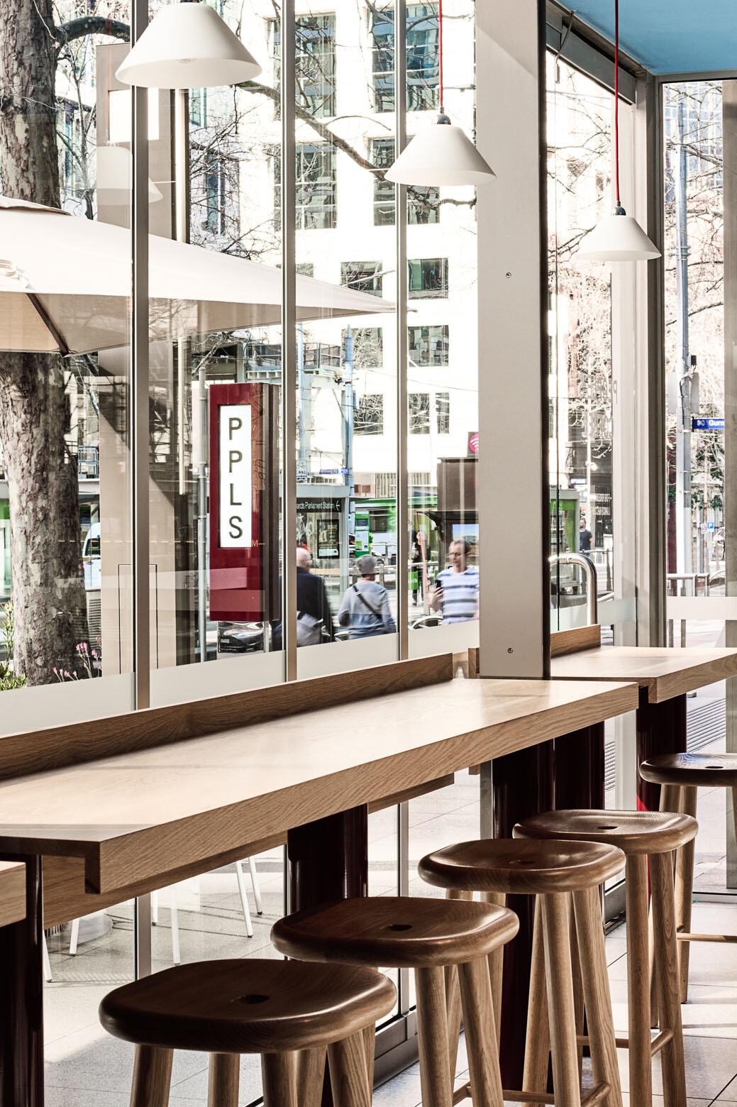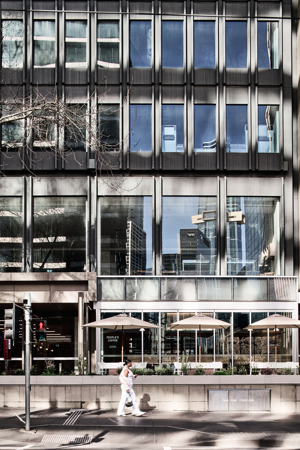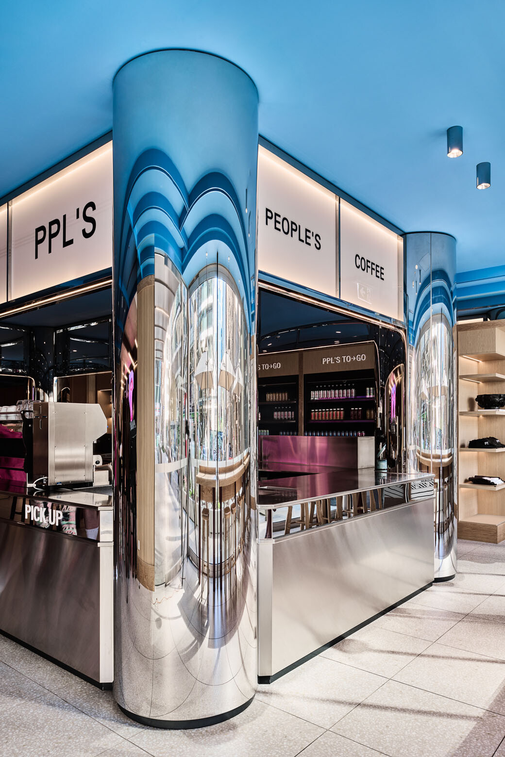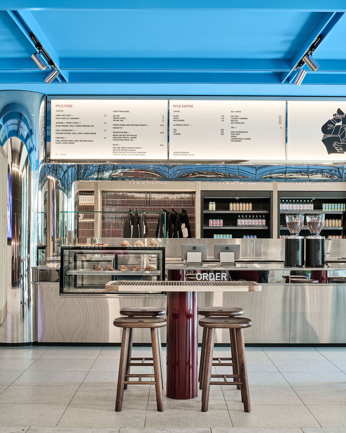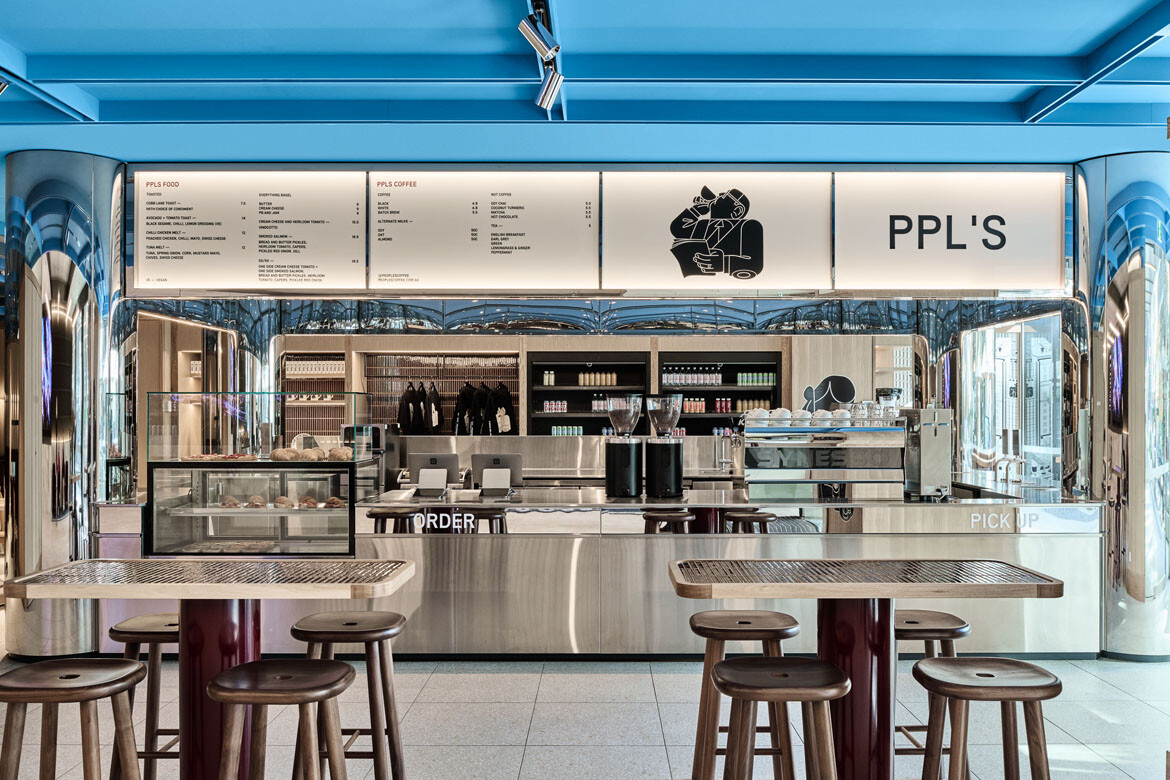 The polished stainless steel columns and surfaces of the kiosk from which the café operates serve to reflect natural, ambient and artificial light as well as movement into all corners of the space, says Addison. “Mirrors are a strategy that we use quite a bit as a studio to activate and bring life to a tenancy,” she explains.