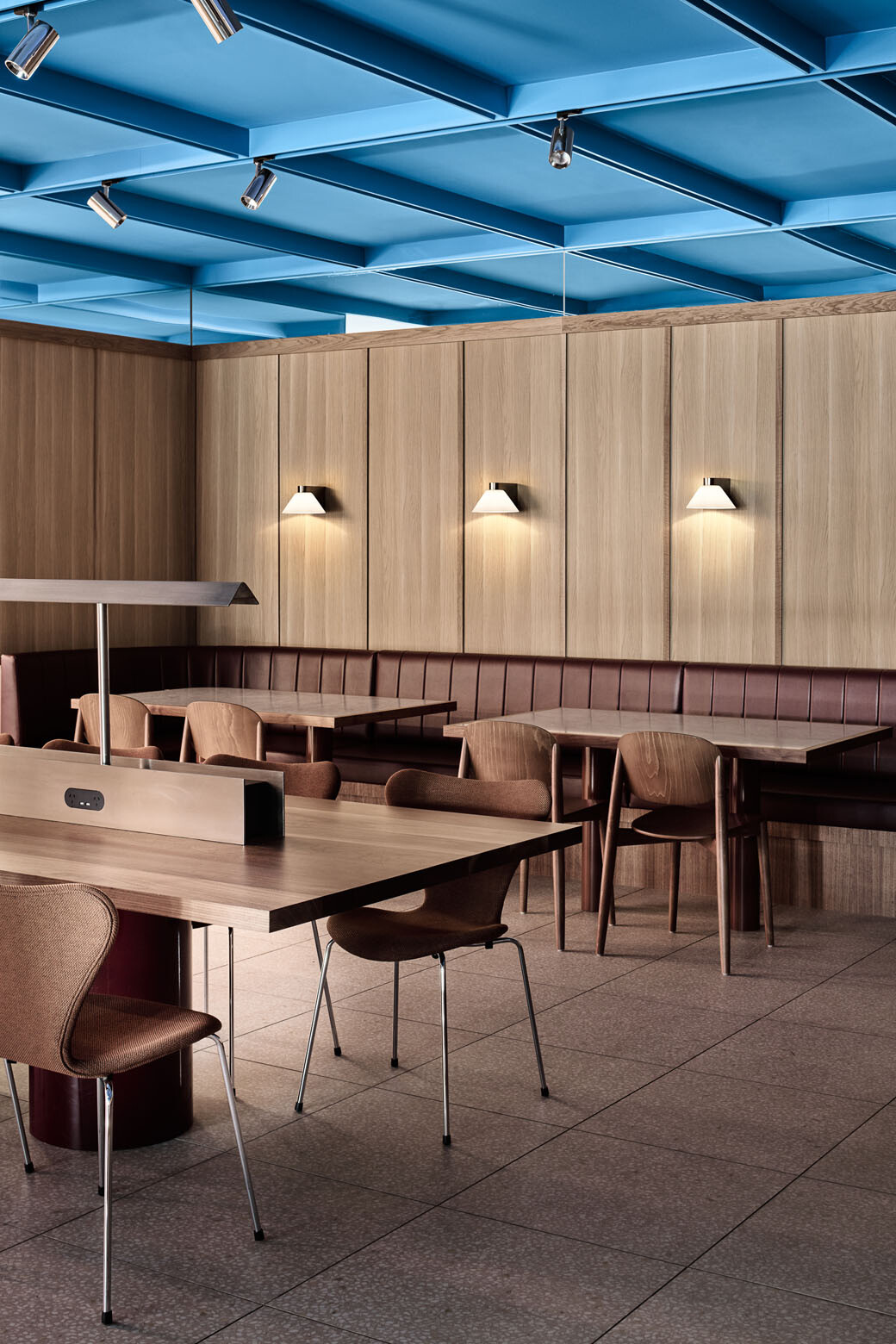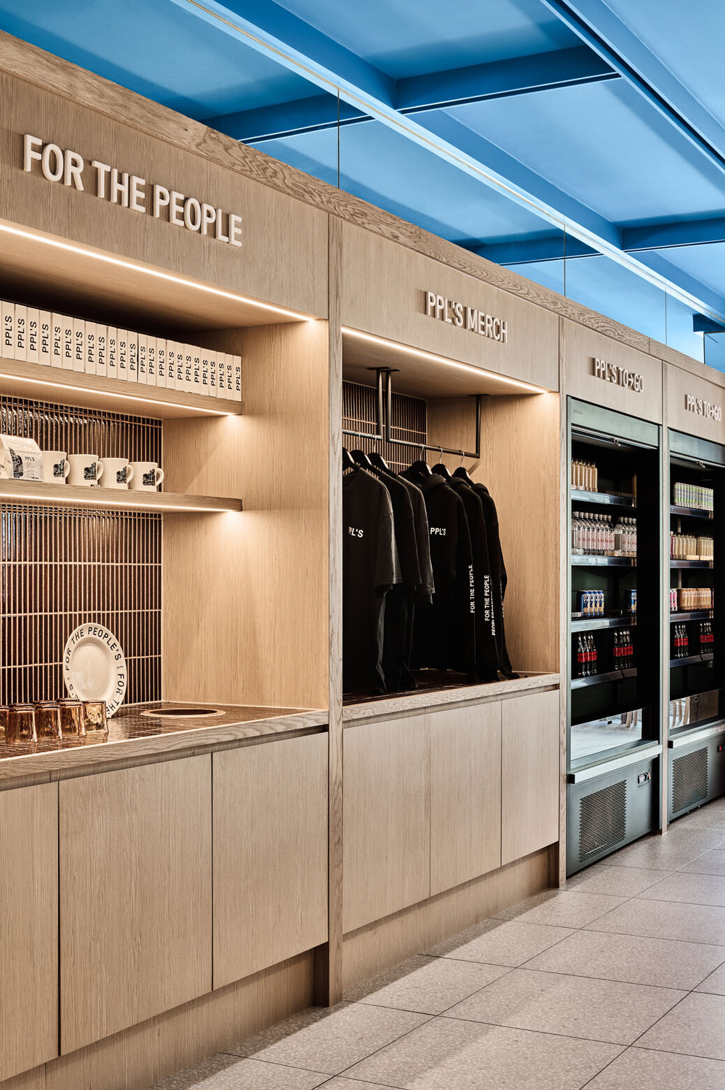 If you’re walking down Collins Street in central Naarm (Melbourne), it’s hard to miss the splash of vibrant blue emanating from a ceiling in one of the office buildings. Should you follow your eyes towards the sky-like blue ceiling, you will find yourself in the lobby of 440 Collins St, which recently opened as a mixed-use space that combines a public café by Peoples Coffee, an office building entrance and a lounge.