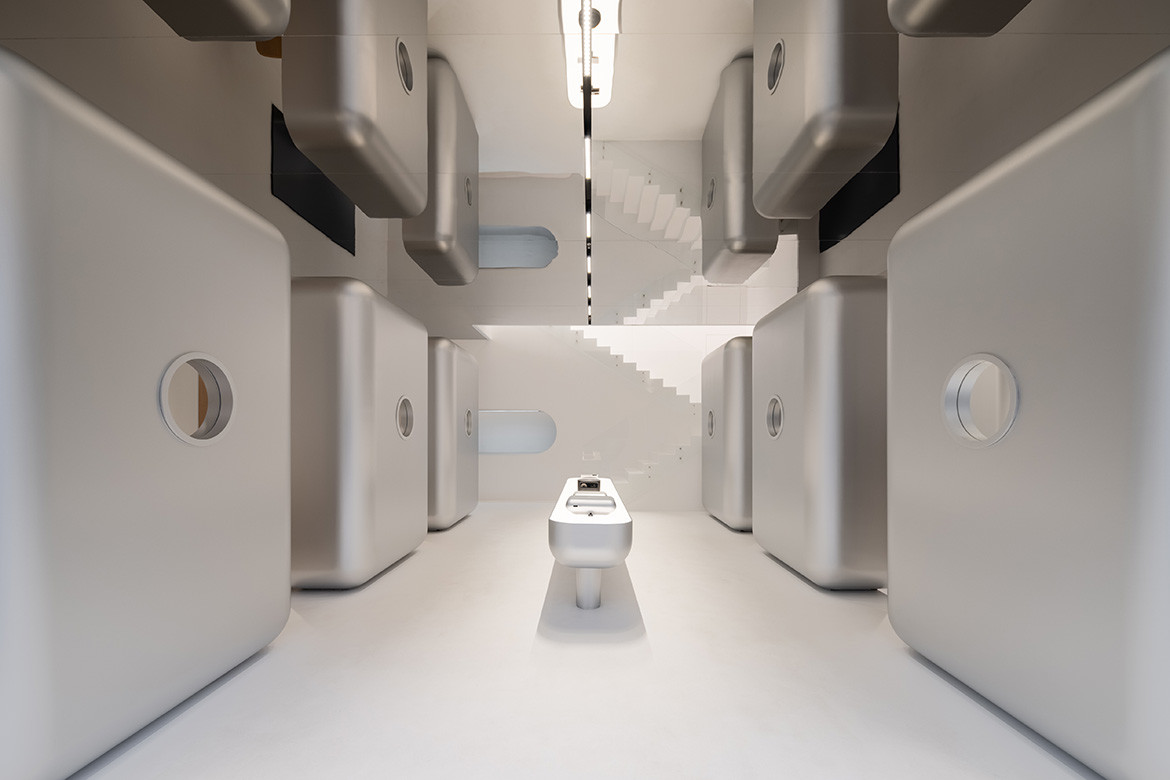 Entry is through an opening shaped as a lens and the door is an aperture that reveals little of what lies behind. The store comprises two levels, the ground floor is the store proper with silver pods that showcase possible use of the products. There are six capsules constructed as vignettes that reveal different scenes from a home – a bedroom, dining room, living room, office, fitness area and game room. A centrepiece table displays product and a mirrored ceiling enhances the height and space.
