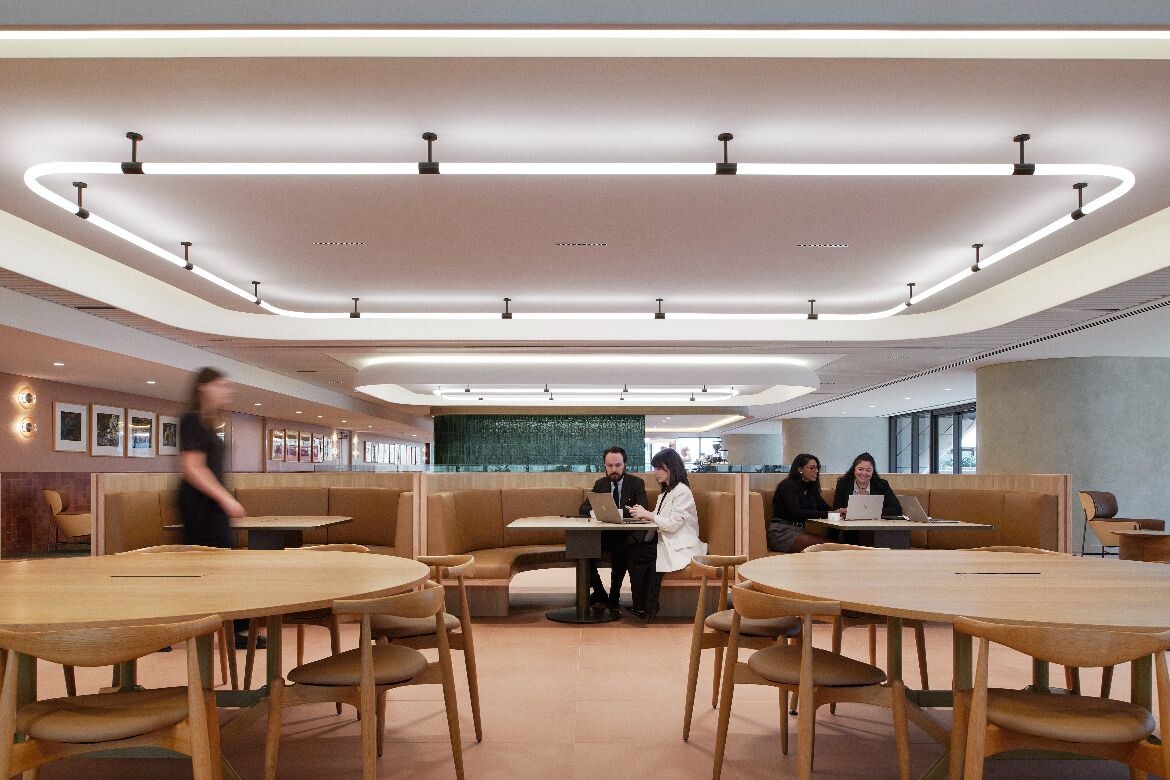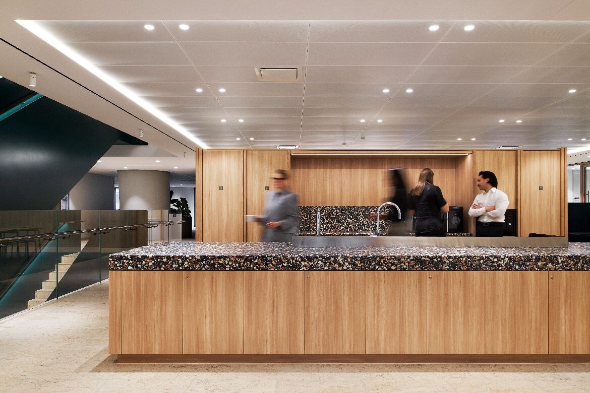 To address both needs, the top floor of the new workspace is devoted to open and flexible gathering spaces, including a café, terrace, event spaces and informal zones that can accommodate small or large-scale events. “This helps provide that all-staff gathering space and informal connection,” Bondin says, and “has especially stood out as a success” in feedback from staff and clients who have been using the new office since July.