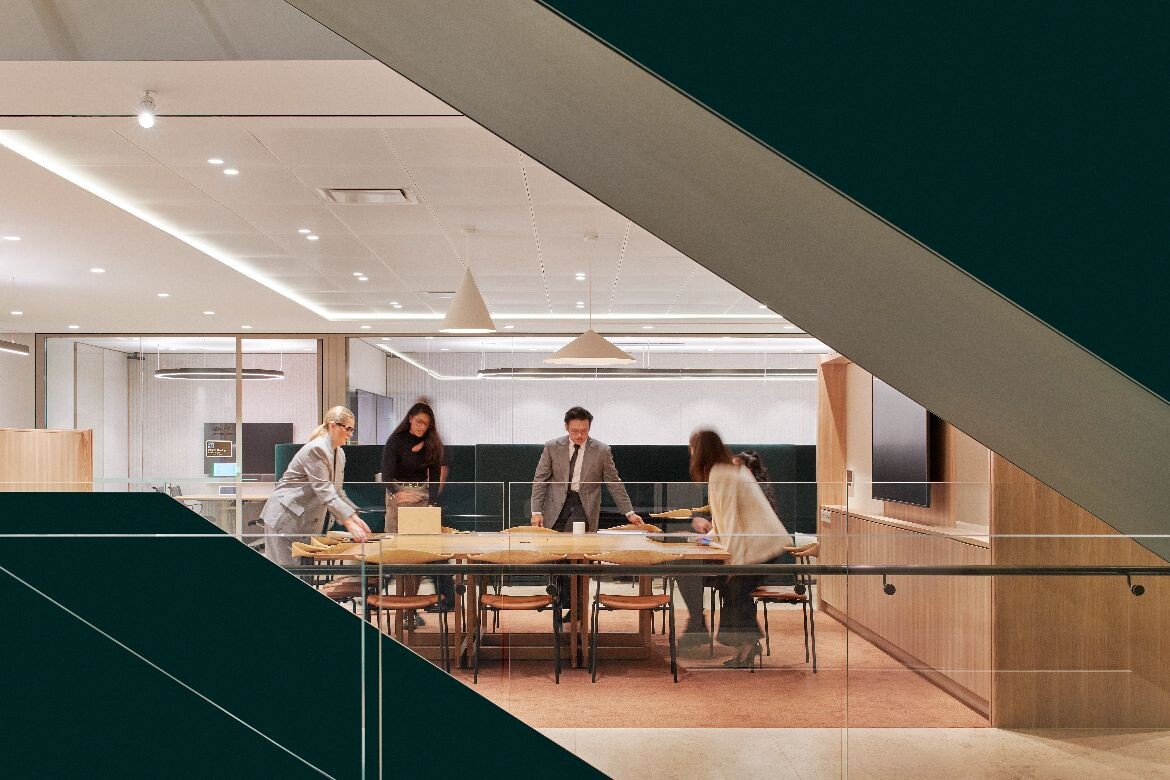 Patricia Bondin, Principal at Architectus, explains that the prominently located staircase with striking teal-green solid bannisters acts as “vertical connective tissue.” It encourages movement between floors and teams while increasing the likelihood of chance encounters.