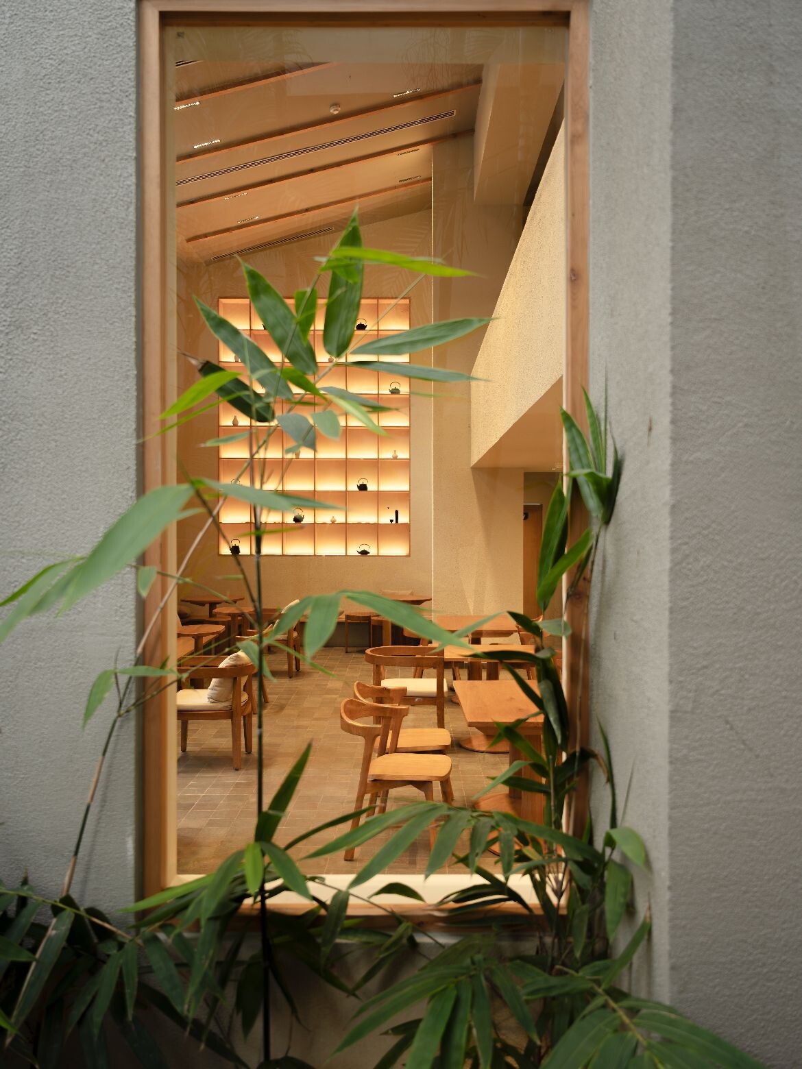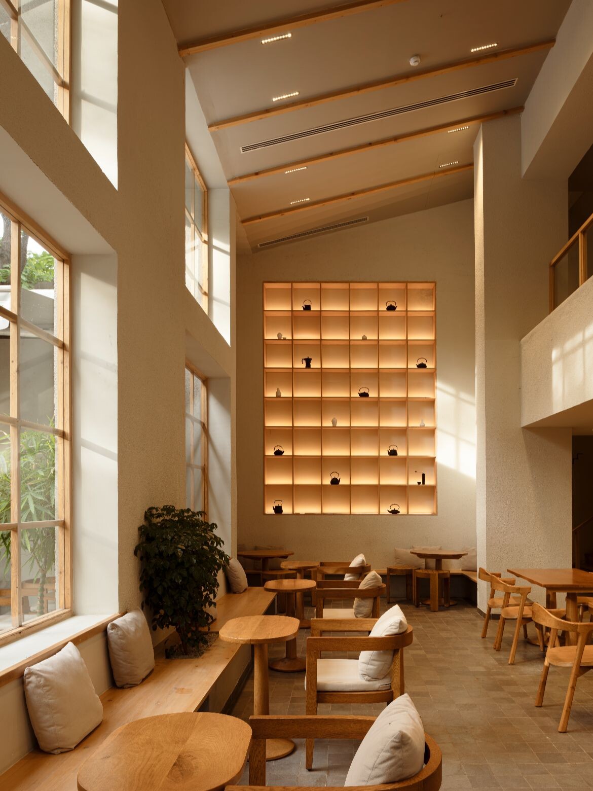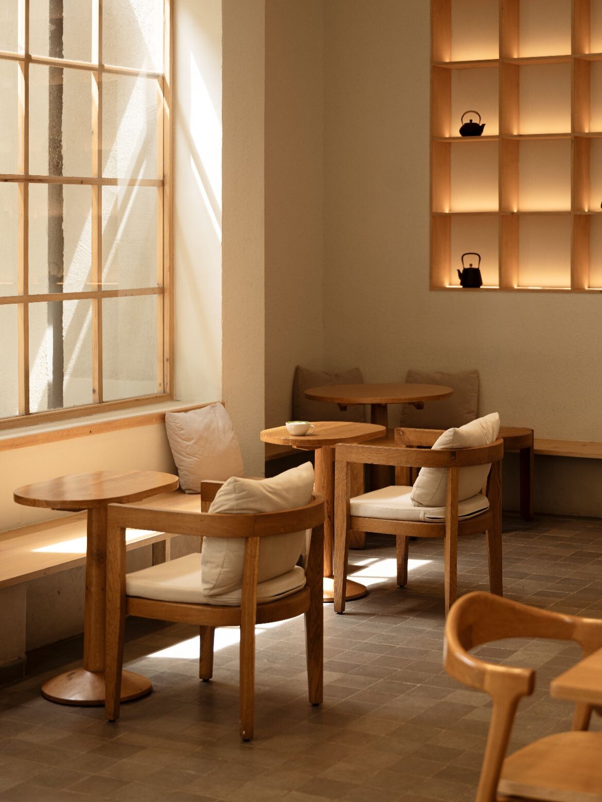 Furniture crafted in solid timber reinforces the material palette, while grid shelving displays curated objects such as vintage kettles. Plastered walls maintain a clean, calming backdrop, and patterned floor tiles echo the ceiling grid overhead. Throughout the day, shifting light casts changing shadows across the interior, subtly marking time and season.