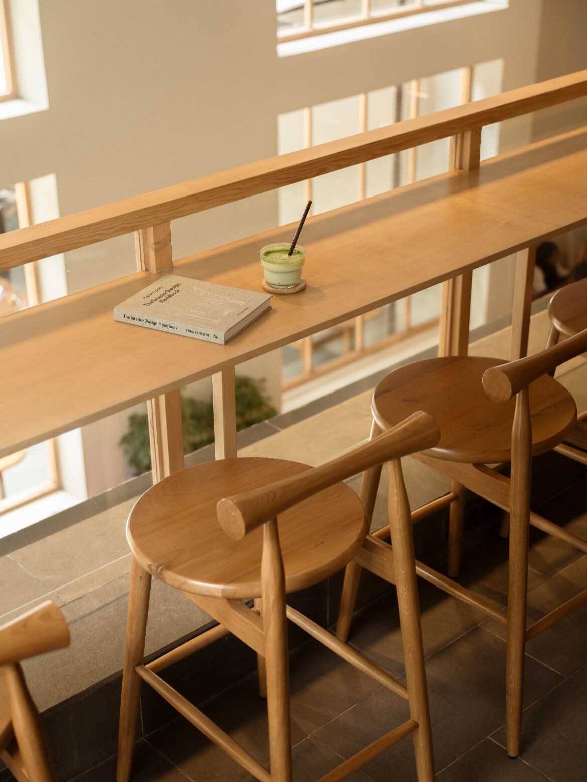 Tall pinewood-framed windows open views to surrounding greenery, allowing natural light to fill the space. A recurring grid motif introduces order and continuity, appearing across floors, walls and ceilings to unify the interior. A 4.8-metre-long timber counter anchors the plan, while seating is varied to suit different modes of occupation, from window nooks and communal tables to high stools on the mezzanine level above.
