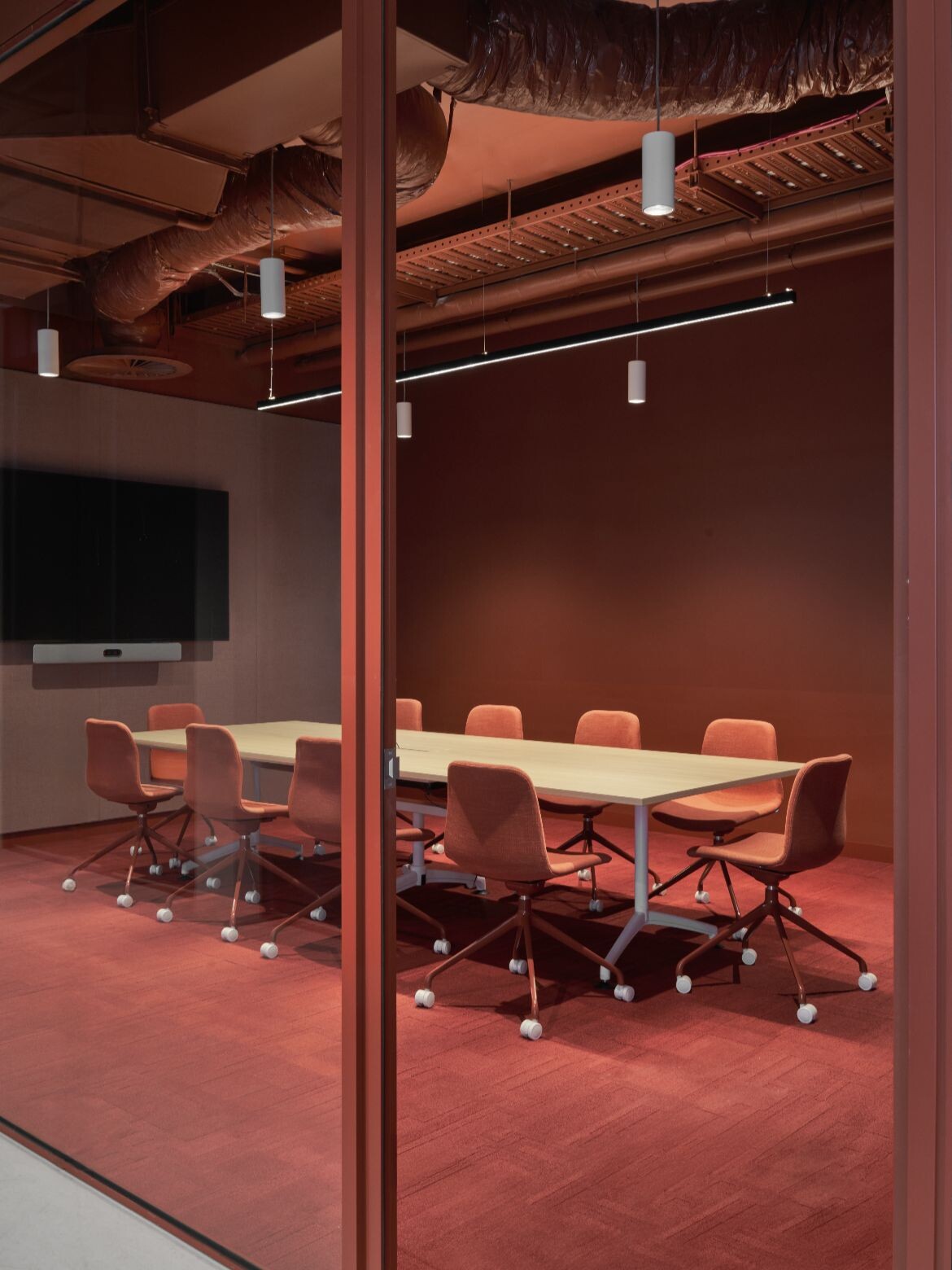 The interior palette draws directly from the building’s heritage fabric, particularly the porcelain tiles of the façade. A predominantly white interior is punctuated with carefully applied colour: a soft mauve-pink defines client spaces on level four, while terracotta and French blue create moments of contrast within meeting rooms and breakout areas.