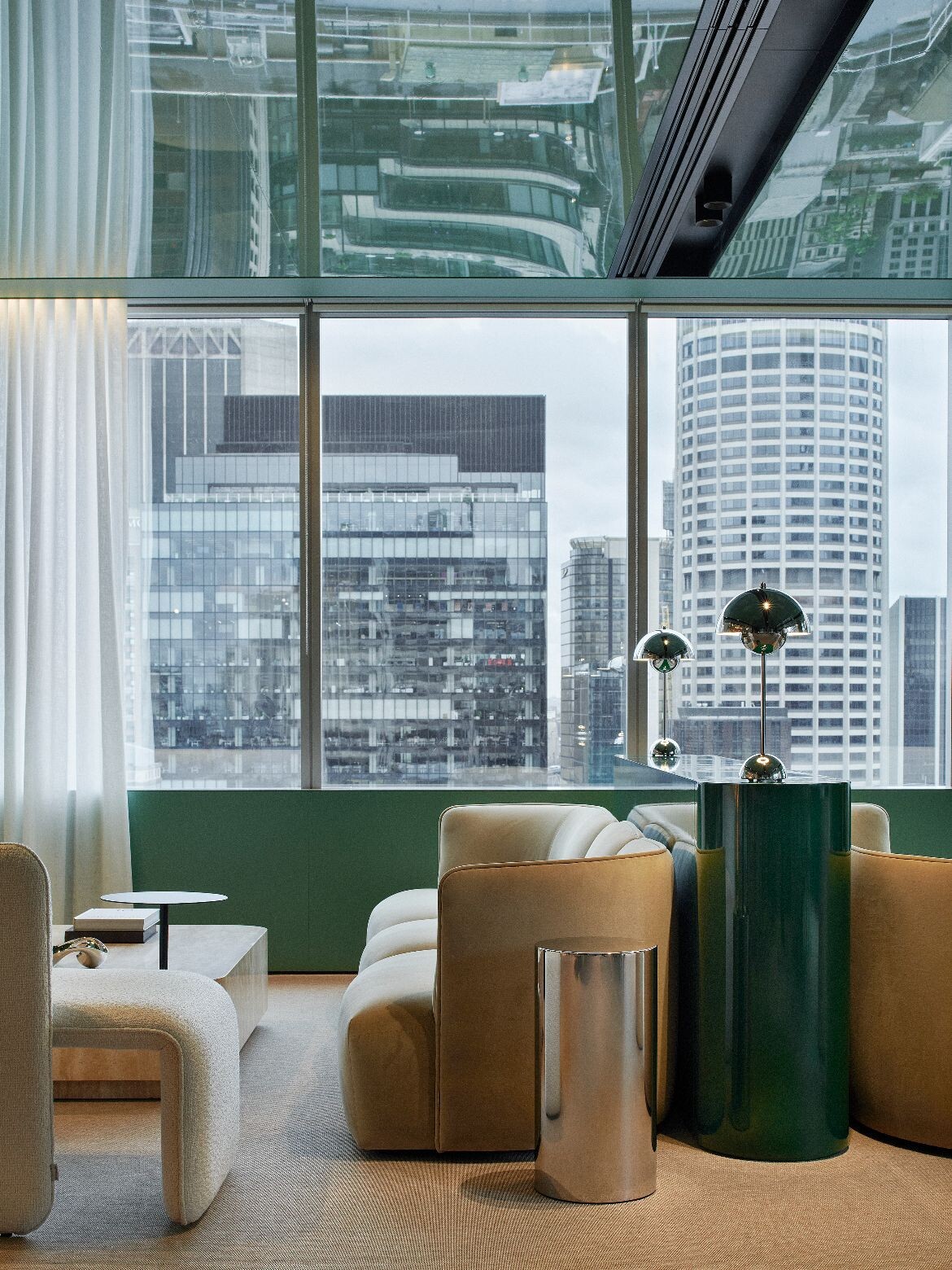Timeless furniture groupings sit atop wool rugs, creating informal meeting points, while planting reinforces the palette and supports wellbeing. Natural light fills the interiors and 360-degree views offer constant connection to the city.