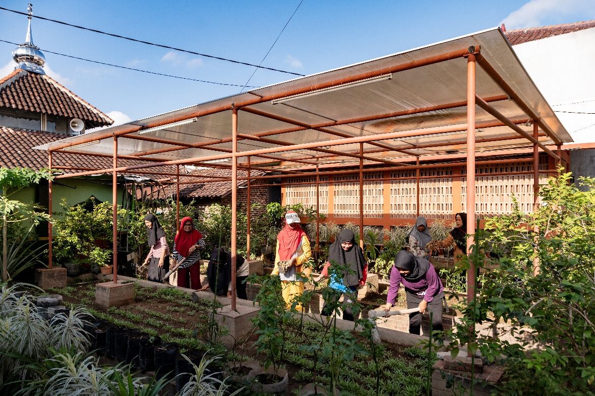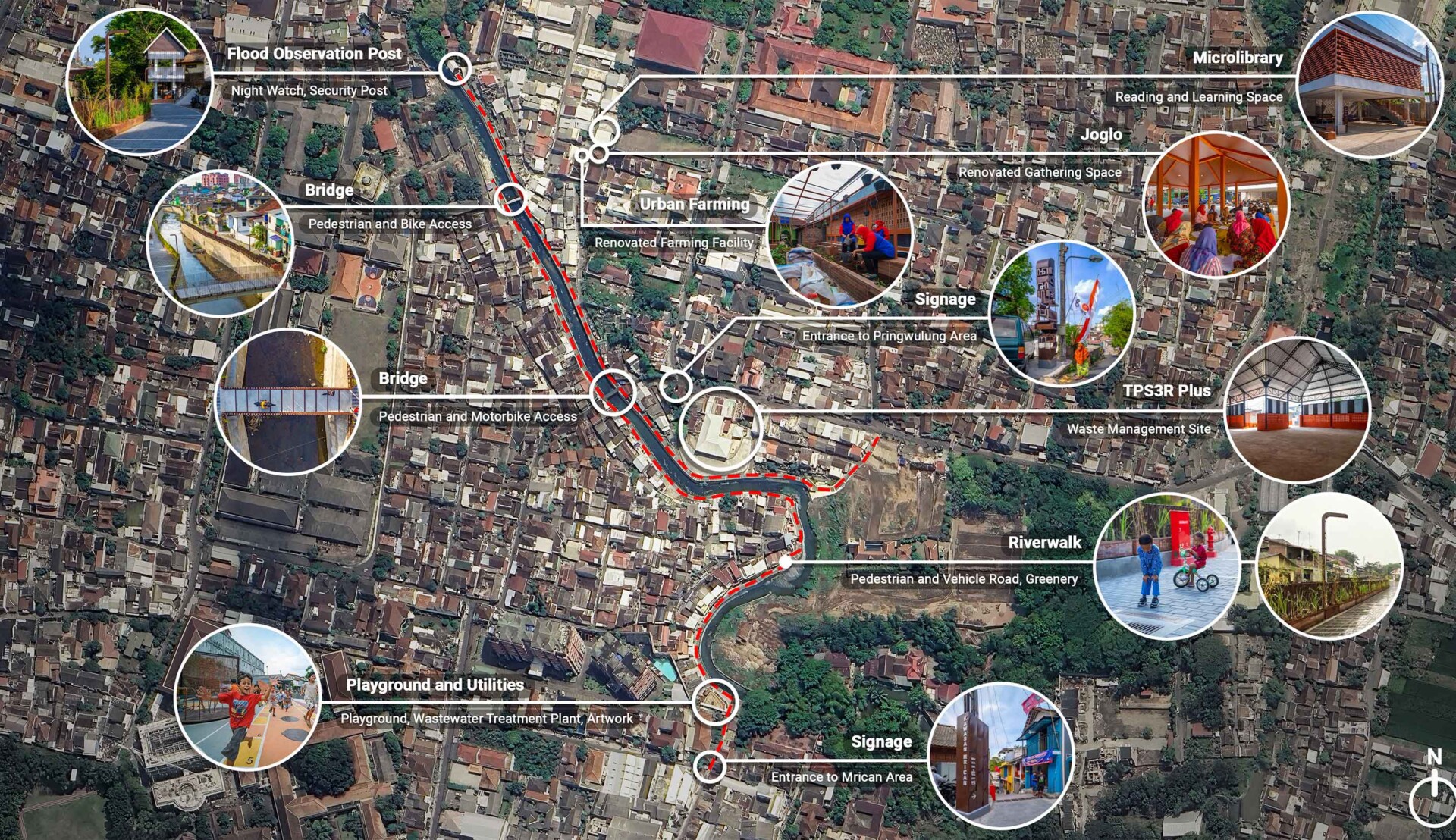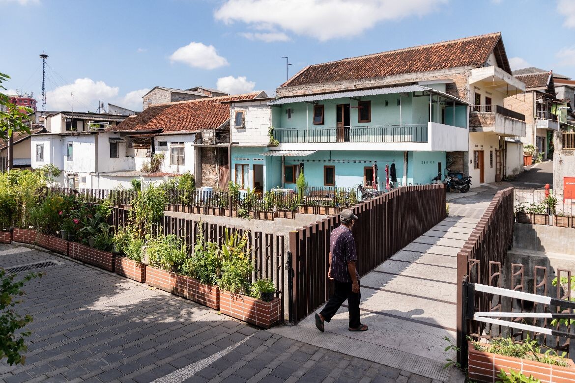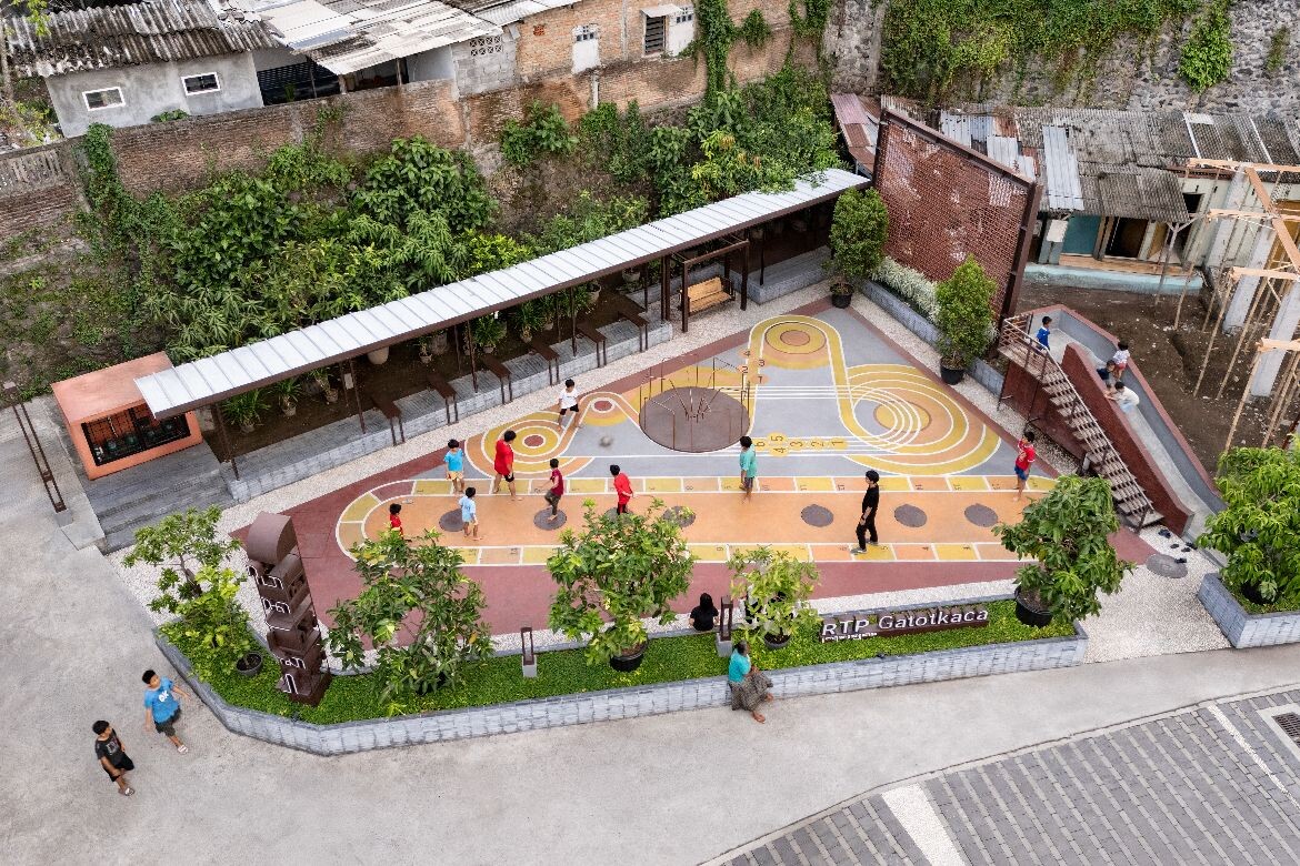 Among the new community amenities is a playground constructed above a wastewater treatment facility, featuring a large Wayang figure of Gatotkaca that references Javanese folklore. New bridges improve connectivity across the site, while a sidewalk system etched with historical Javanese texts delivers educational and ecological messages to pedestrians.