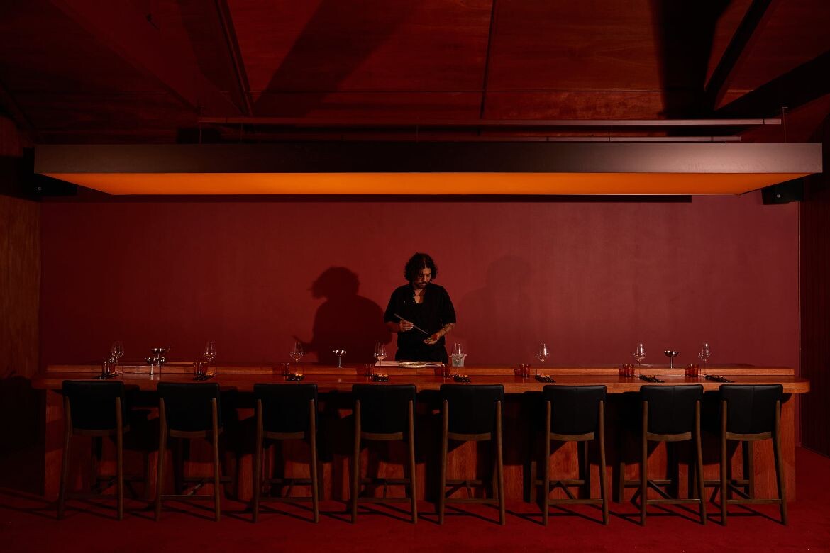 Further inside, the main dining room is conceived as a more intimate environment, featuring panelled Japanese red timber walls and a cherry-red ruched leather banquette. Adjacent is an eight-seat Omakase bar offering a 12-course sushi and sashimi experience, where diners can observe the chefs at work.