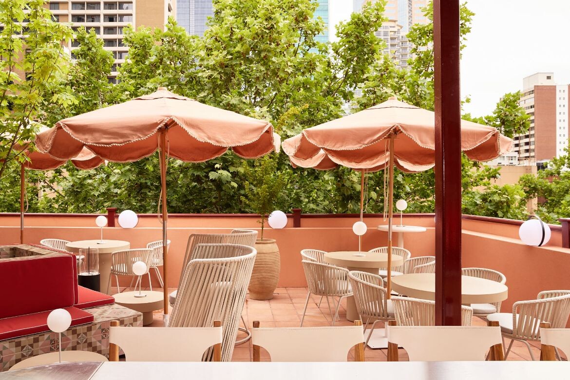 The interior palette leans into warm amber, terracotta and red tones, creating a cocooning atmosphere softened by layered textures and materials. Outside, the terrace features terracotta tiles, beige furnishings and salmon-pink umbrellas, framing views across treetops and the Melbourne skyline. An additional bar supports the outdoor area, while above, a 30-seat private dining room known as The Tokyo Sky Mezzanine provides space for larger gatherings.