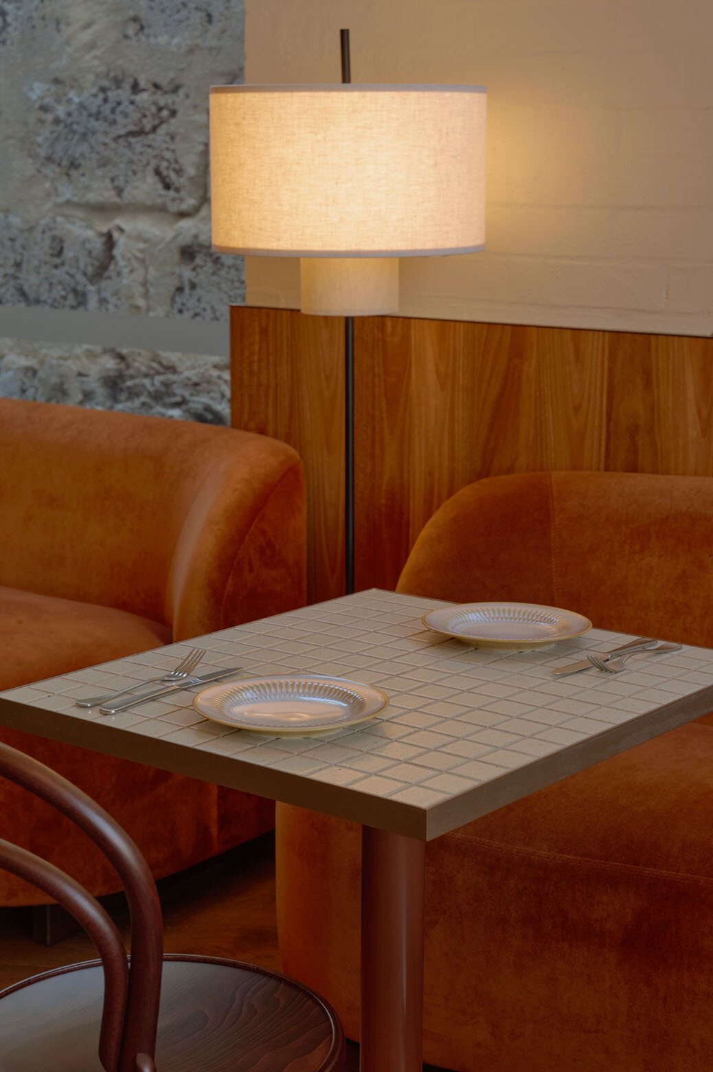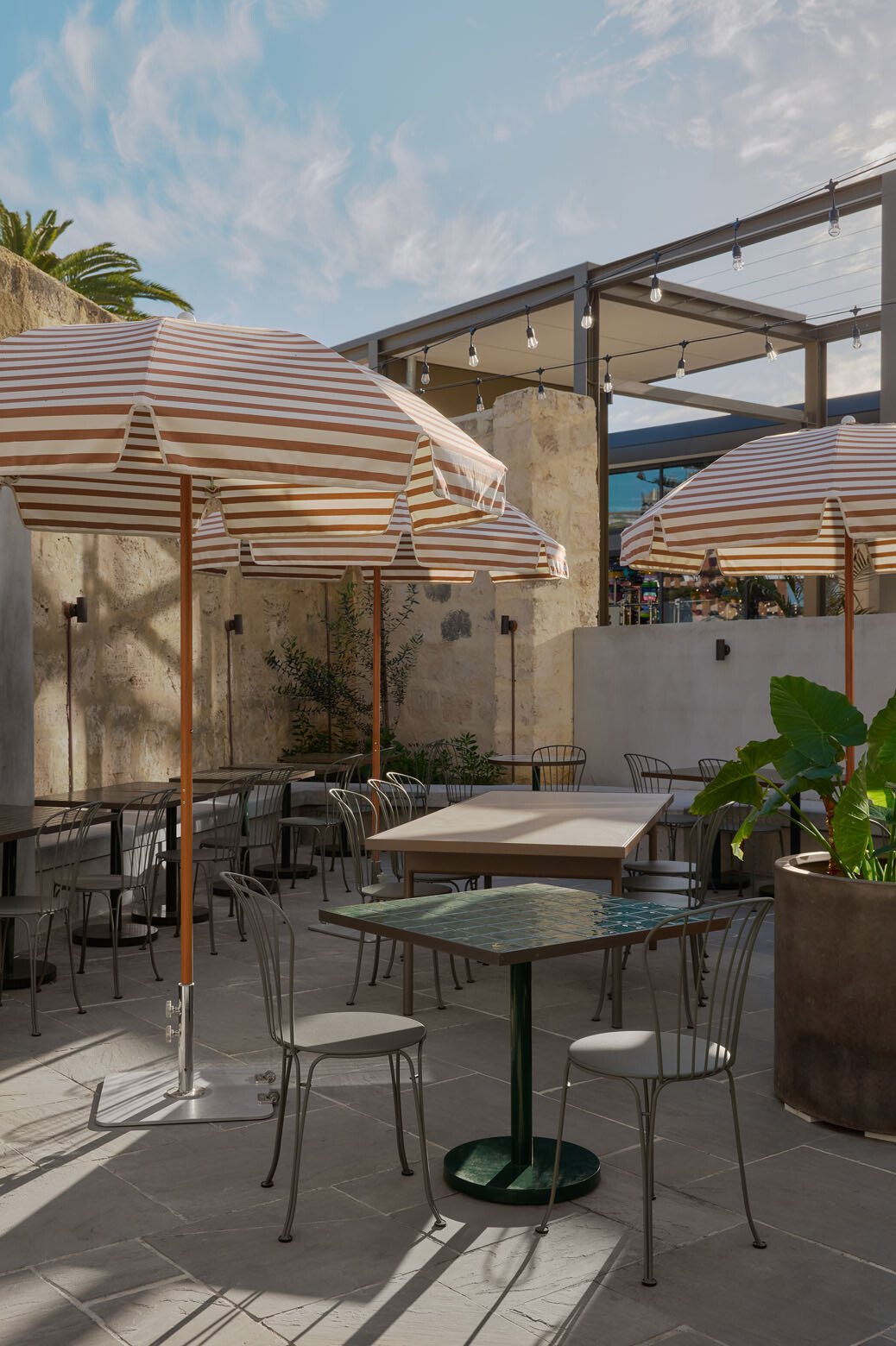 Anglesea is designed to shift naturally across the day, moving from bright mornings to more atmospheric evenings. Australian Spotted Gum and Smoked Eucalyptus sit alongside lantern-like ceiling elements, bespoke lighting and custom furniture, softening the scale of the open plan. Associate Director Renae Tapley describes the interior as an exploration of craft and industry, ideas closely tied to Fremantle’s maritime heritage and limestone foundations. This is most clearly expressed in the bespoke marquetry tables, composed of local Jarrah, Marri and Woody Pear veneers.