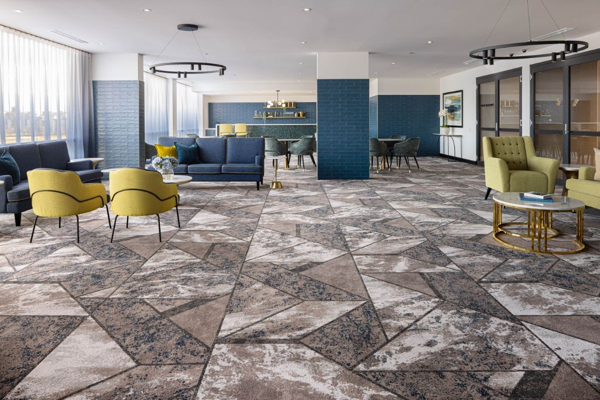 Residents’ rooms and hallways feature a subtly patterned, neutral carpet in variegated shades of earth tones speckled with blue to promote calmness and a return to nature. The sweeping architecture of the Chapel, with its massive windows and a vaulted ceiling, is complemented by a patterned carpet of gently overlapping squares in muted tones.